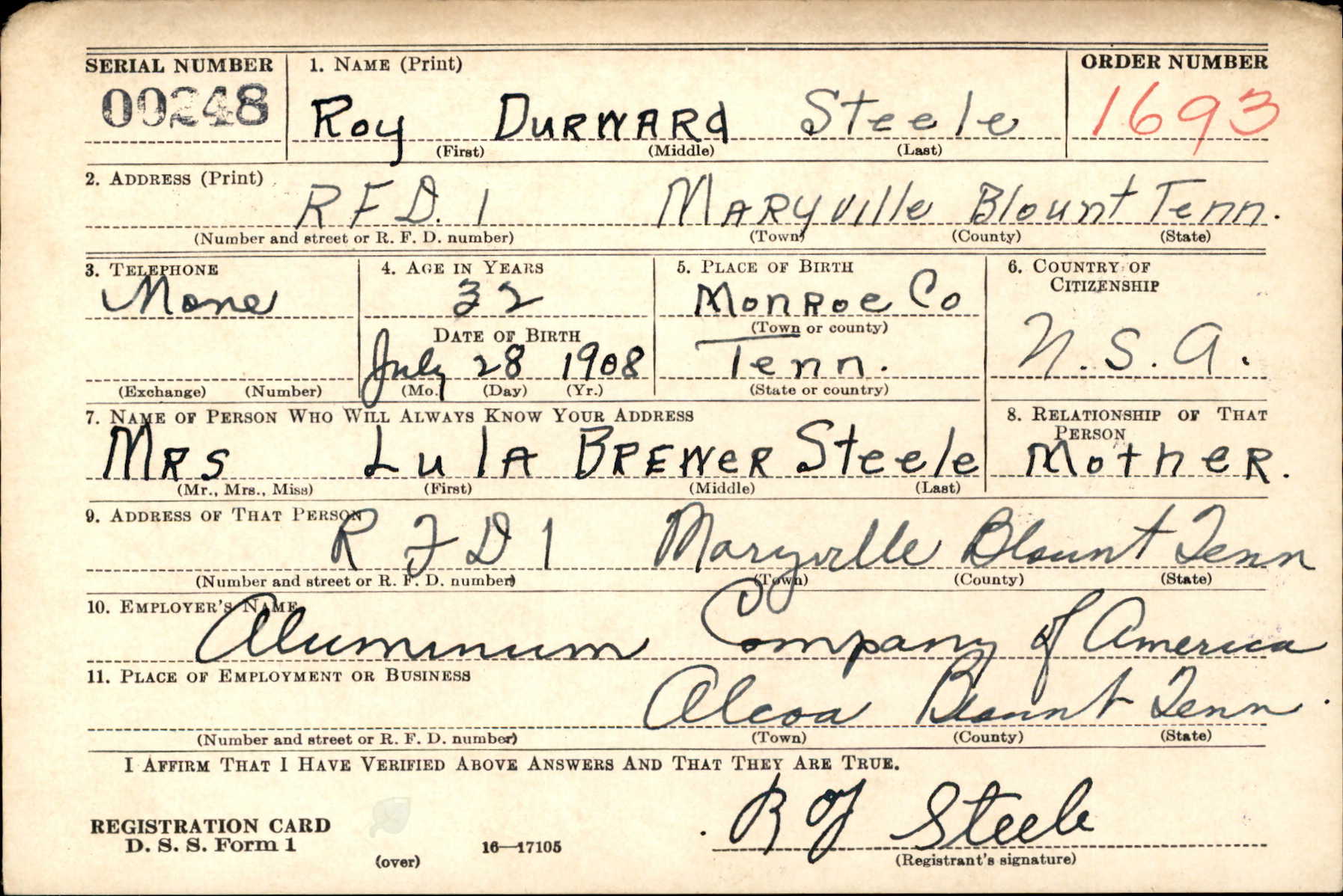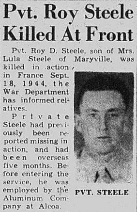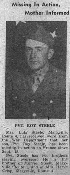 Private Roy D. Steele was born in 1908. He was the son of Arthur Bee Steele and Lula Brewer Steele. He had three brothers, Murriel Steele, Claude Steele, Louis Steele, all of whom served in the military during World War II. He had two sisters, Hettie Steele and Annis Steele.