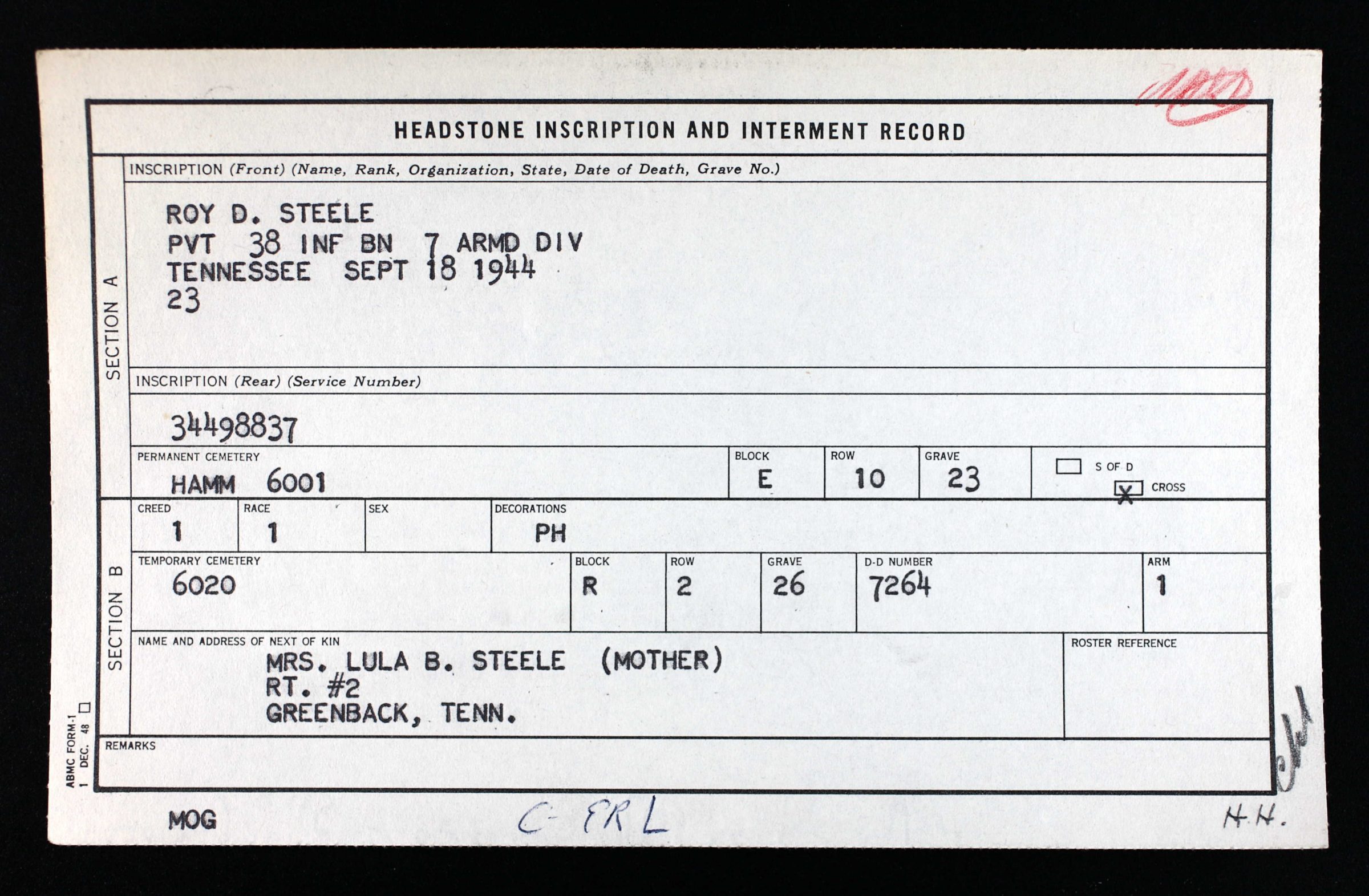 Private Steele enlisted in the military on December 9, 1942 in Fort Oglethorpe, Georgia. He served in the European Theater of the war as a rifleman with Company A, 38th Infantry Battalion, 7th Armored Division. His last duty was in Sillegny, France. He was reported missing in action on September 22, 1944. Eventually, the War Department reported that Private Steele was killed in action on September 18, 1944 in Sillegny, France. He is buried in the Luxembourg American Cemetery in Luxembourg City, Luxembourg (Plot E, Row 10, Grave 23).