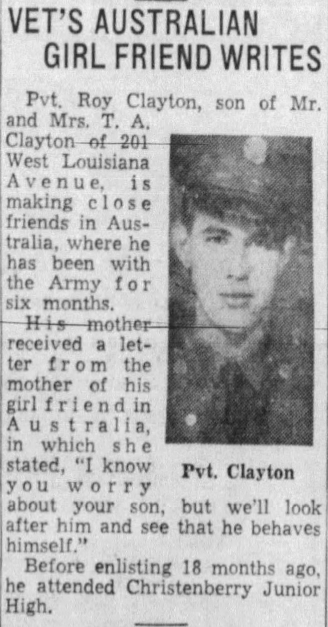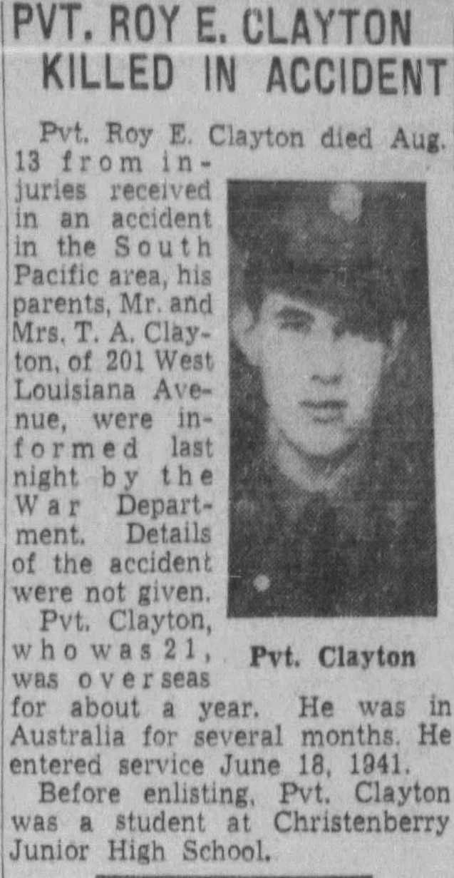Pvt. Roy E. Clayton died Aug. 13 from injuries received in an accident in the South Pacific area, his parents, Mr. and Mrs. T.A. Clayton, of 201 West Louisiana Avenue, were informed last night by the War Department. Details of the accident were not given. Pvt. Clayton, who was 21, was overseas for about a year. He was in Australia for several months. He entered service June 18, 1941. Before enlisting, Pvt. Clayton was a student at Christenberry Junior High School.