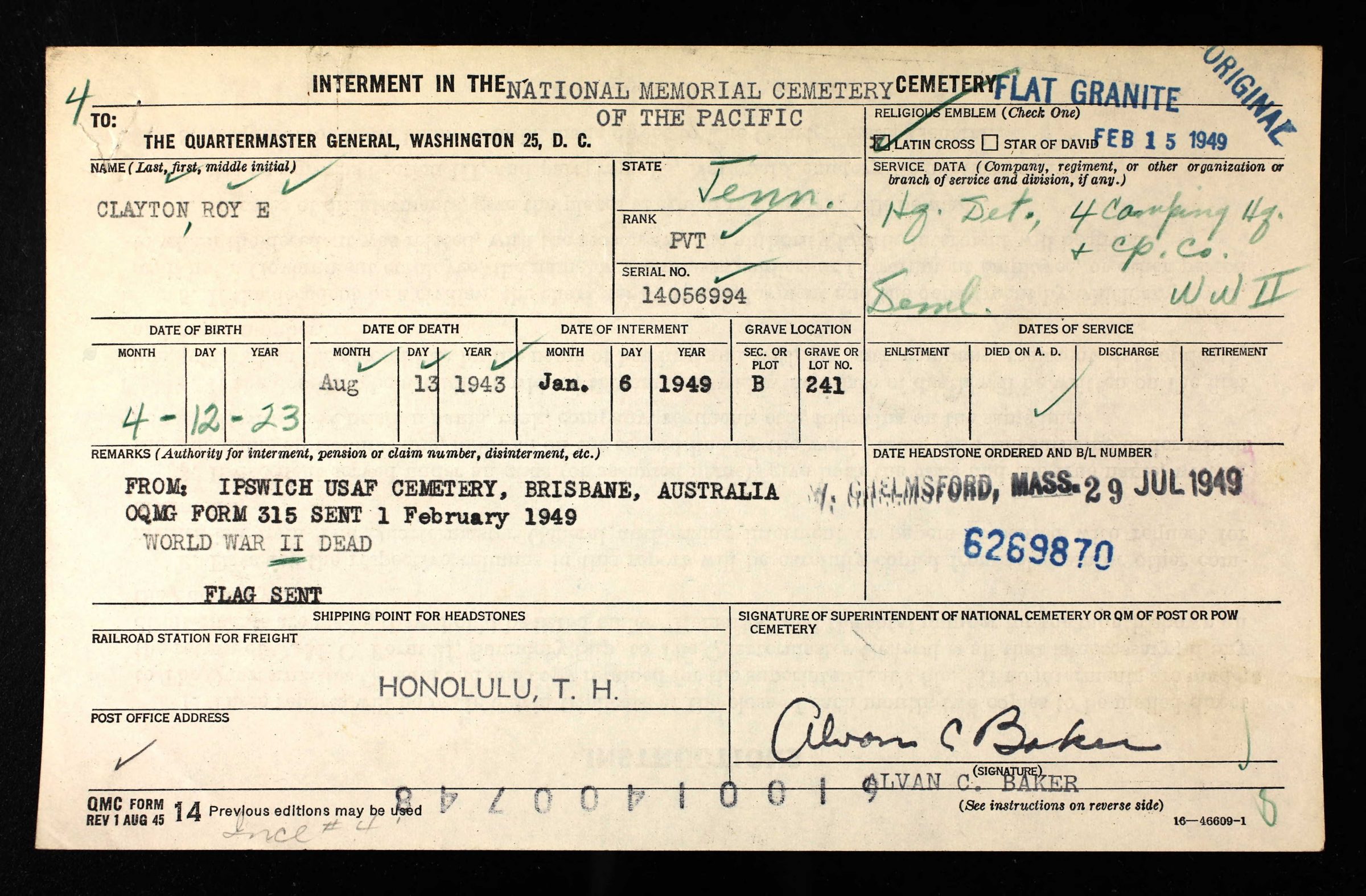 He enlisted on June 20, 1941, Fort McPherson, Atlanta, GA. U.S. Army, Demolition Detachment. Buried at Honolulu Memorial in Honolulu, HI, USA, B, 241. He was returned from Ipswich USAF Cemetery in Brisbane, Australia.