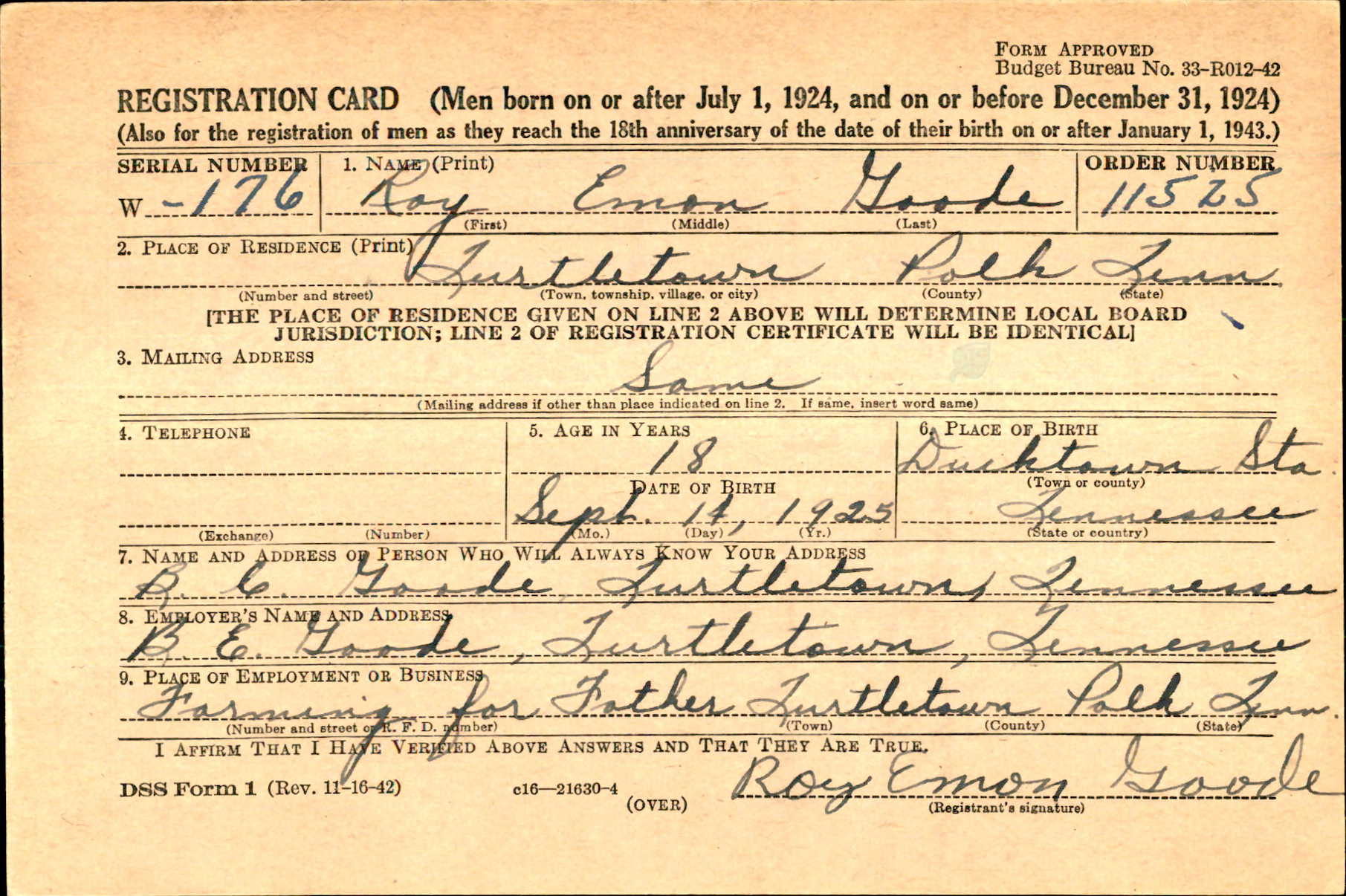 Roy Emon Goode was born on 14 September 1925 in Ducktown to Belaam Chester “B.C.” Goode and Spicy Allen Conner.