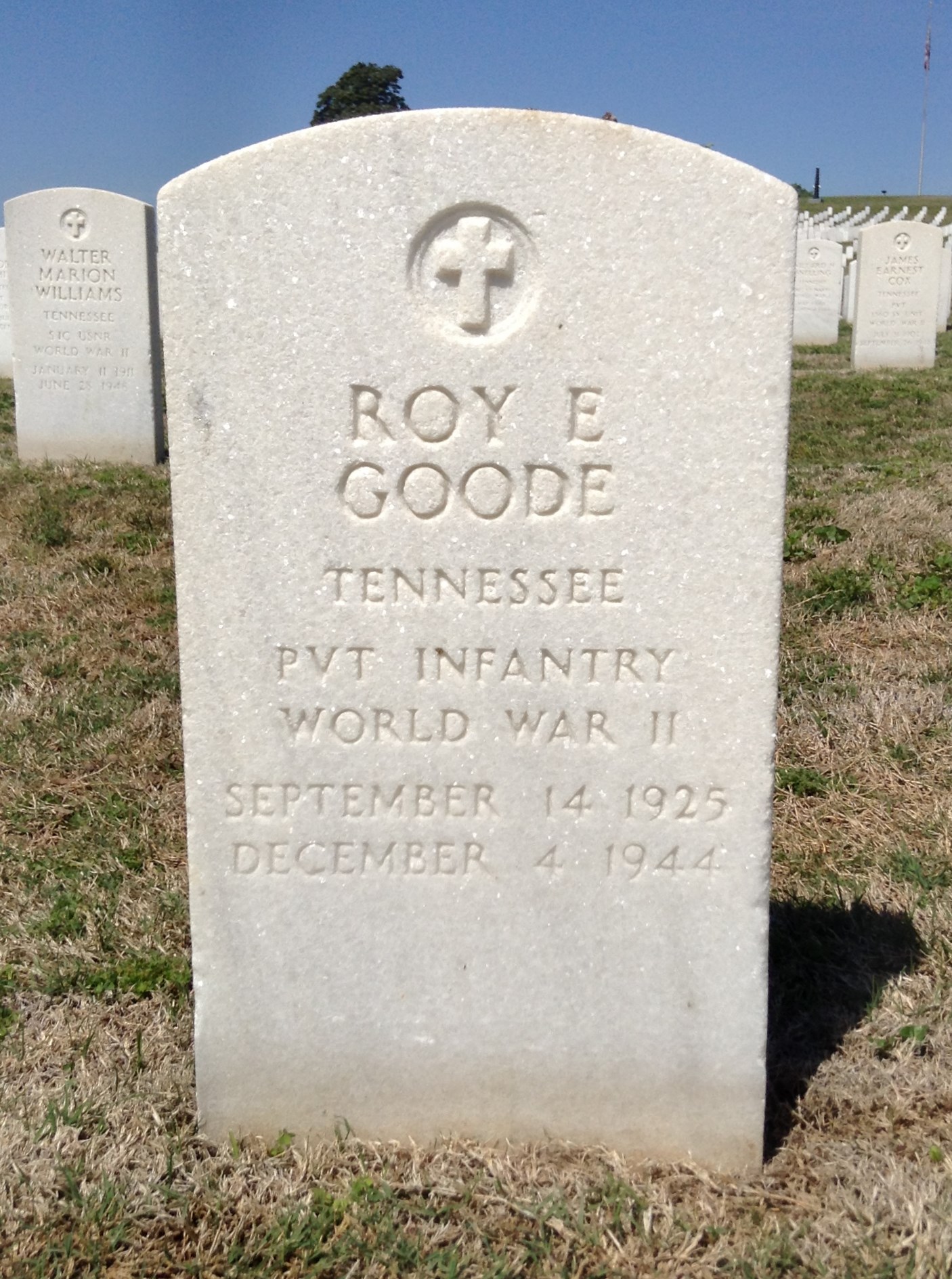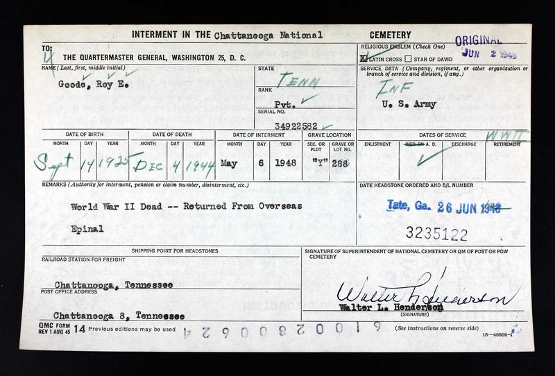 Pvt Goode was initially buried at Epinal in France. He is buried at the Chattanooga National Cemetery, Y, 288