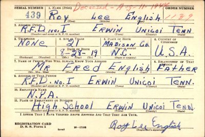 Roy Lee English was born on 28 August 1920 in Madison County, North Carolina to Fred English and Clara Hardin.