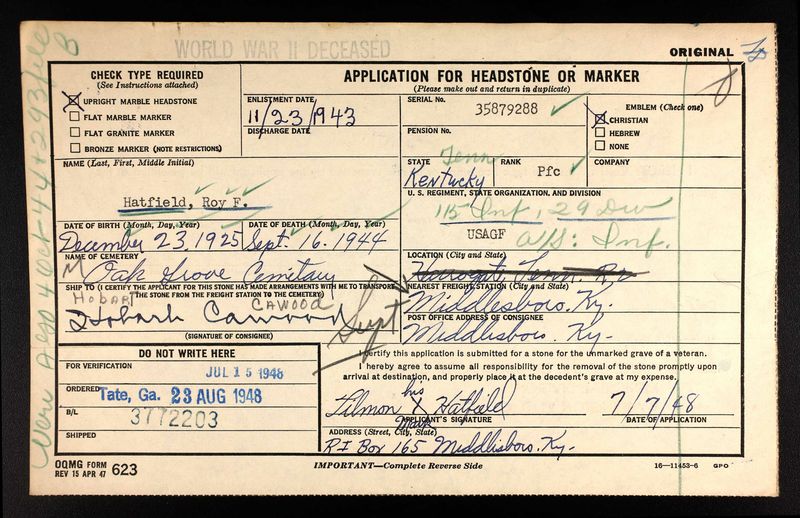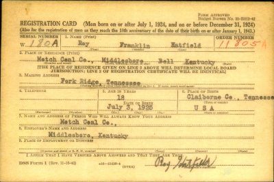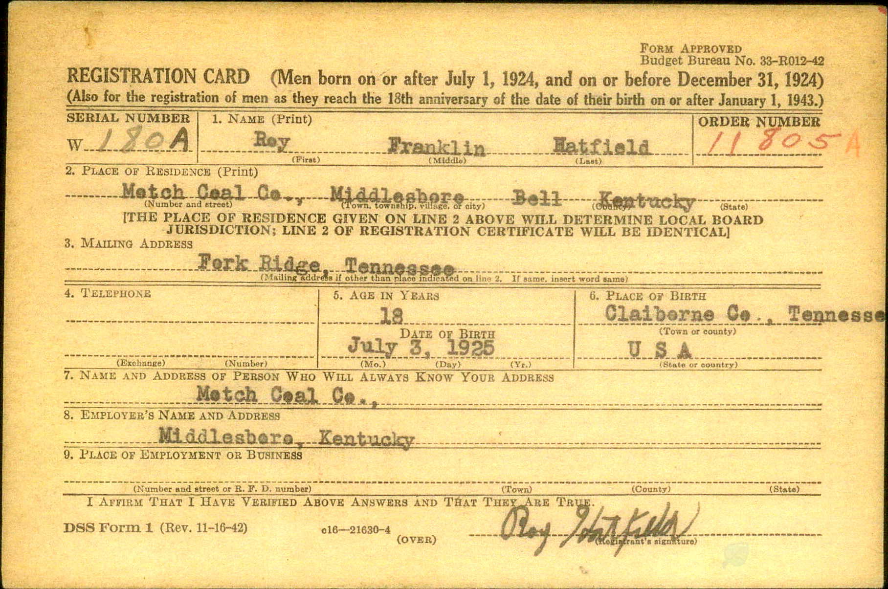 Roy Franklin Hatfield was born on 23 December 1925, the son of Tilmon Hatfield and Bertha Davis.