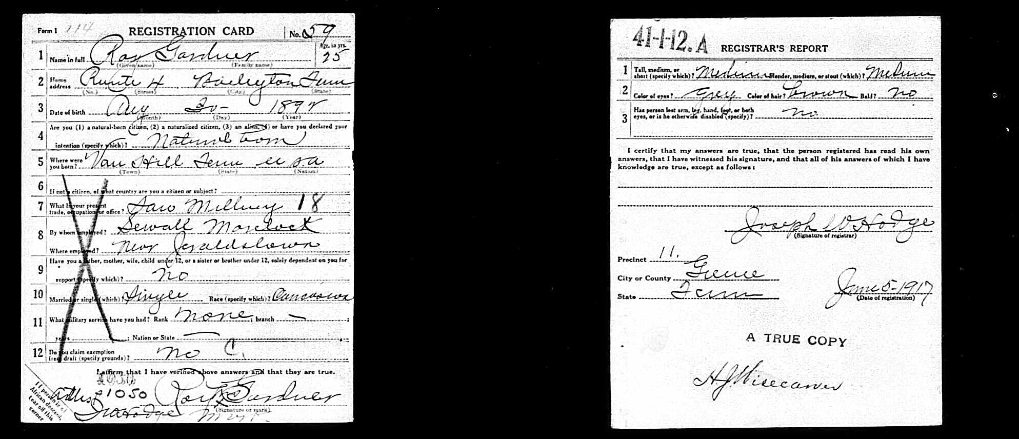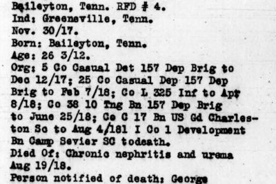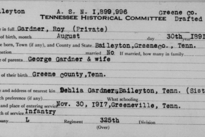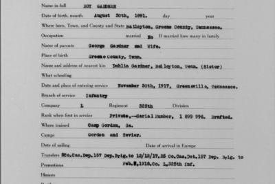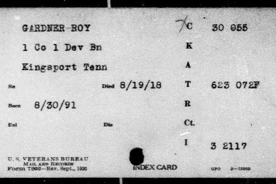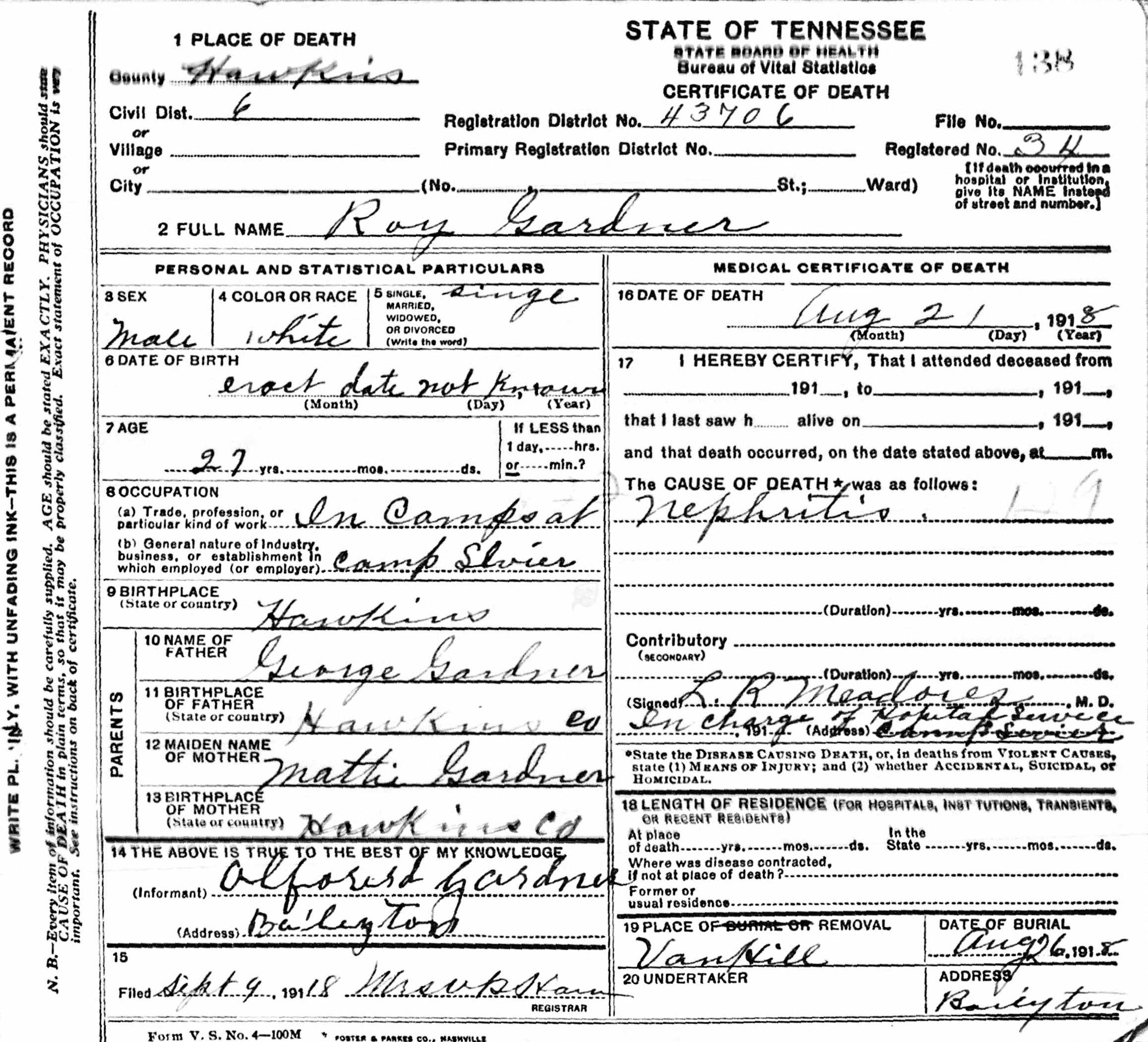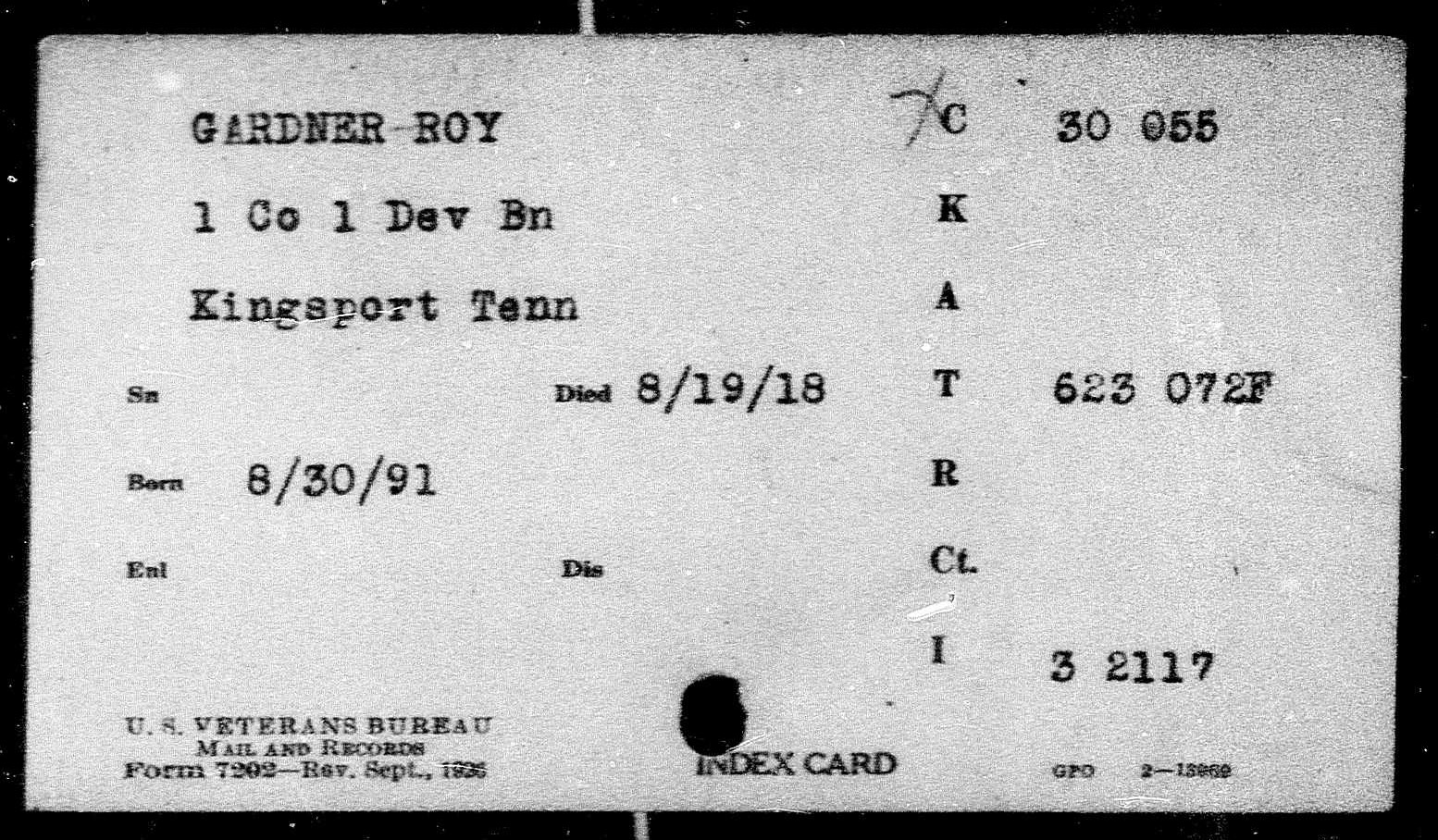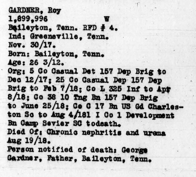 Roy Gardner was born in Baileyton, Greene County, Tennessee, son of George Washington Gardner and Martha Almira McLain. He entered the service on 30 November 1917 at Greenville and trained at Camp Gordon in Georgia and Camp Sevier, South Carolina where he died of nephritis at the age of 26.