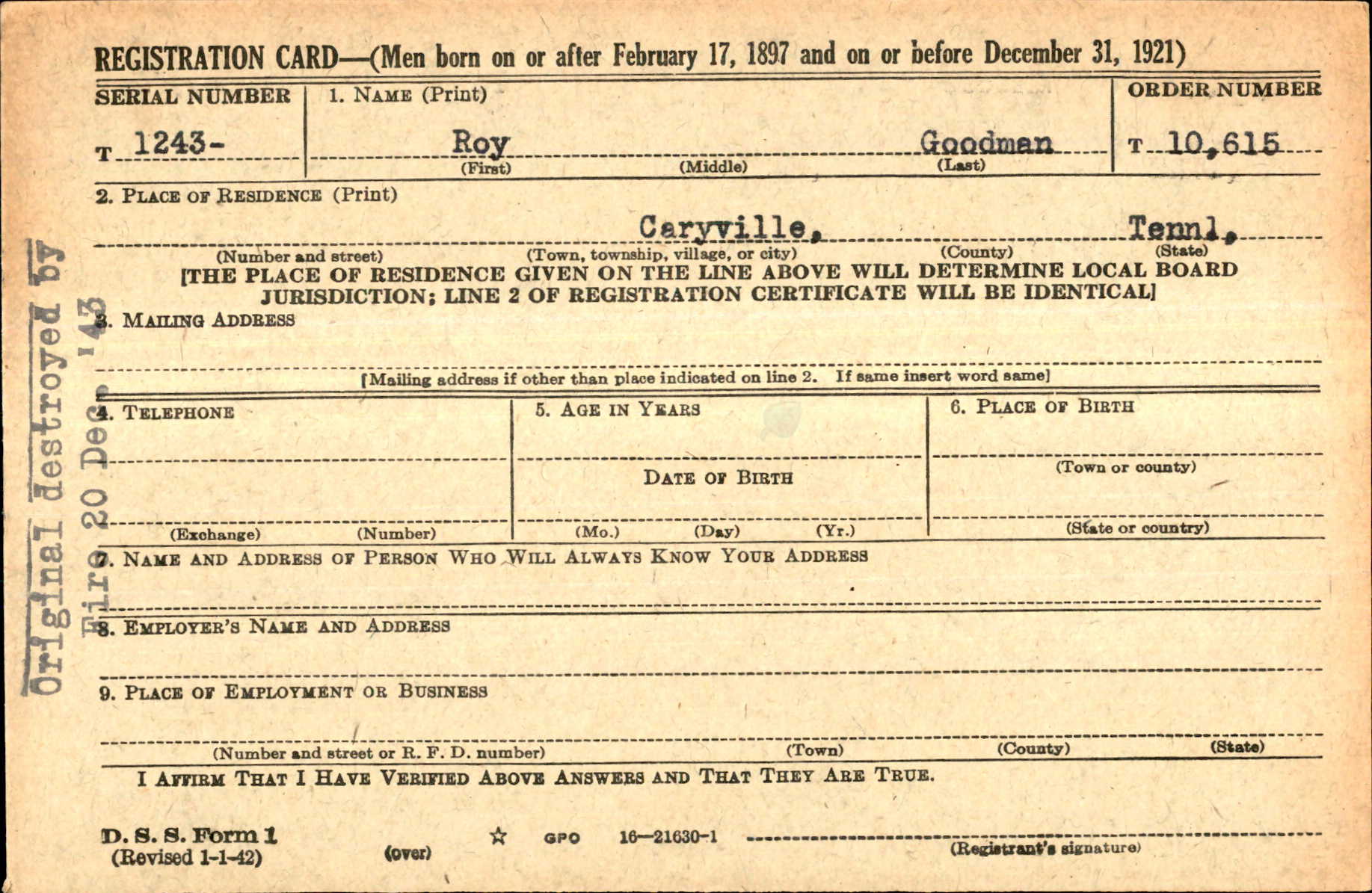 I have been looking up information on my family, and we come from a small town in East Tennessee; most are coal miners etc etc and are not very good in expressing themselves or talking about the past. I’ve always been interested in my family’s history and a lot of the old timers are respected and appreciated in our small town and have a lot of history; my papaw is Timus Goodman and we are in Caryville, Tennessee, and he is the youngest and only living one left I think; I believe Roy was his eldest brother.