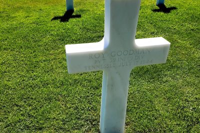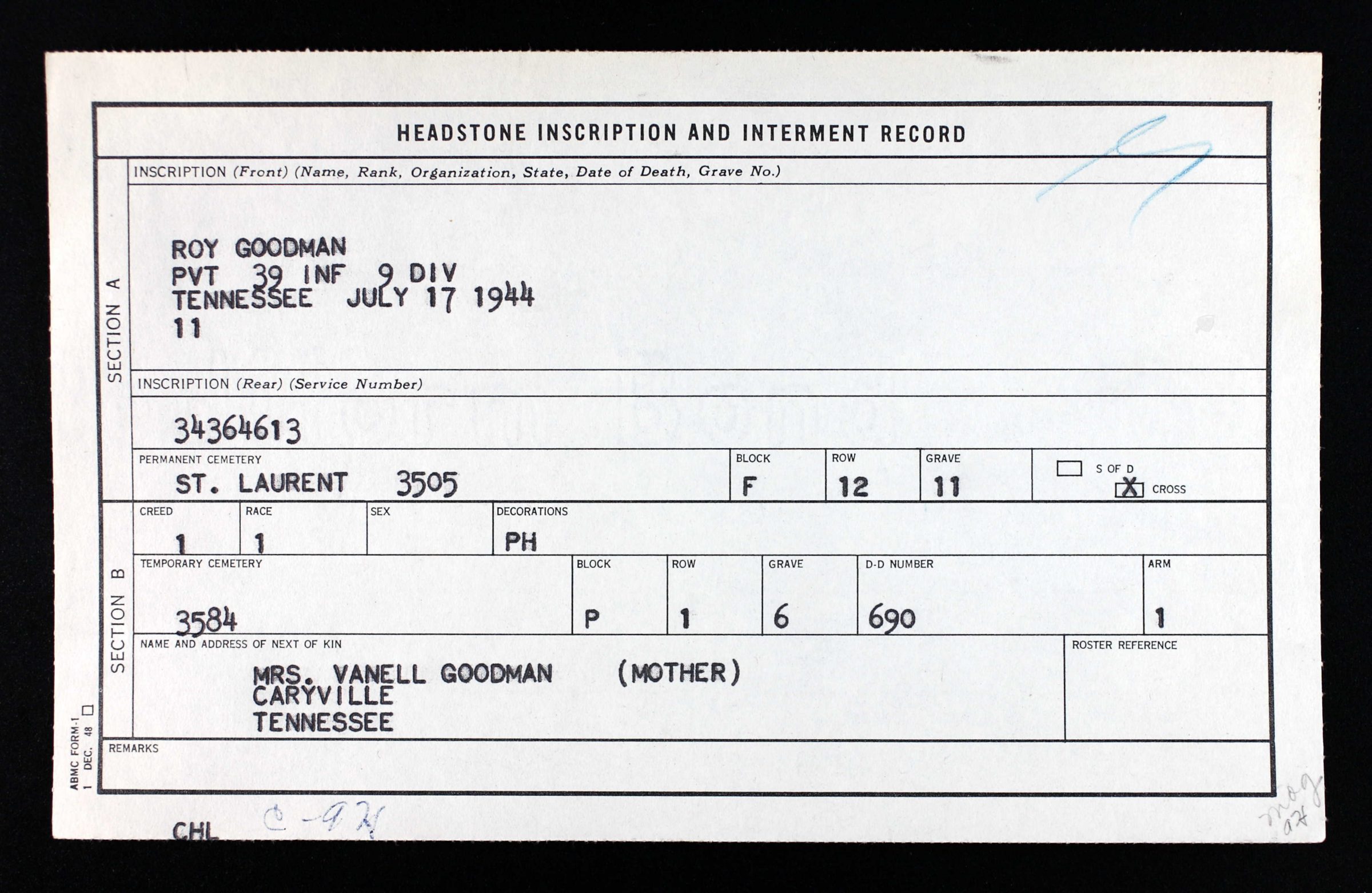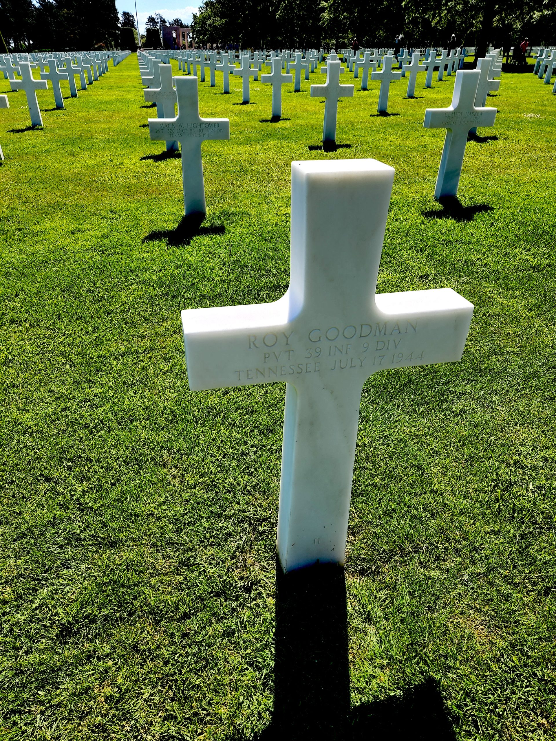 Private Goodman was killed in action on the 17th of July 1944. He is interred at the Normandy American Cemetery, Colleville-sur-Mer, France, plot F, row 12, grave 11.