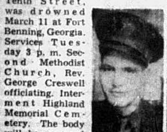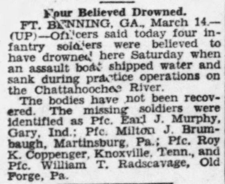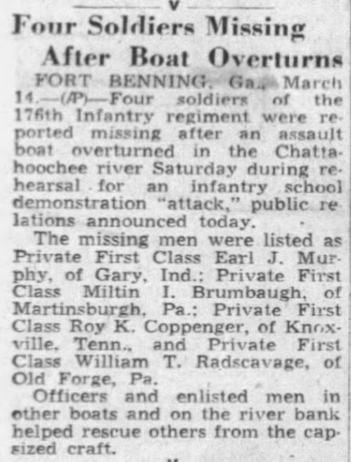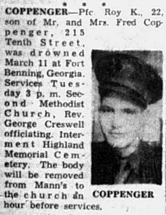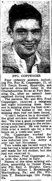 Four infantry soldiers, including Pfc. Roy K. Coppenger, 21, of 215 Tenth Street, Knoxville, are believed drowned today in the Chattahoochee River at Fort Benning, Ga., after an assault boat capsized during maneuvers. The parents, Mr. and Mrs. Fred Coppenger, received a telegram last night informing them their son is missing since the boat overturned. The bodies of the four missing men had not been found. “I can’t believe he is drowned,” the grief stricken mother said today. “He was a good swimmer and always enjoyed going to the swimming pools here. He was home a little over a month ago for a few hours on a week-end pass.”