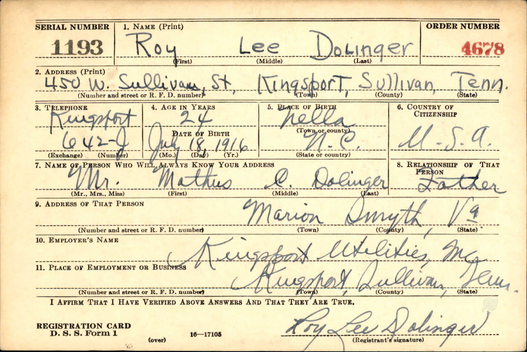 Roy Lee Dolinger was the son of Mathus Calvin Dolinger and Martha Kelley. He married Johnie Lee in November, 1942.