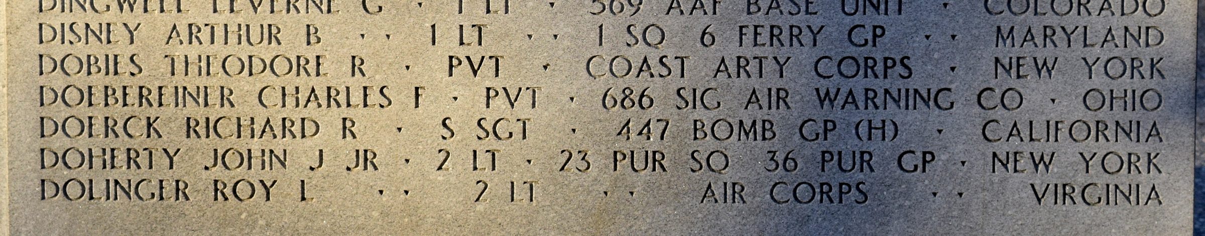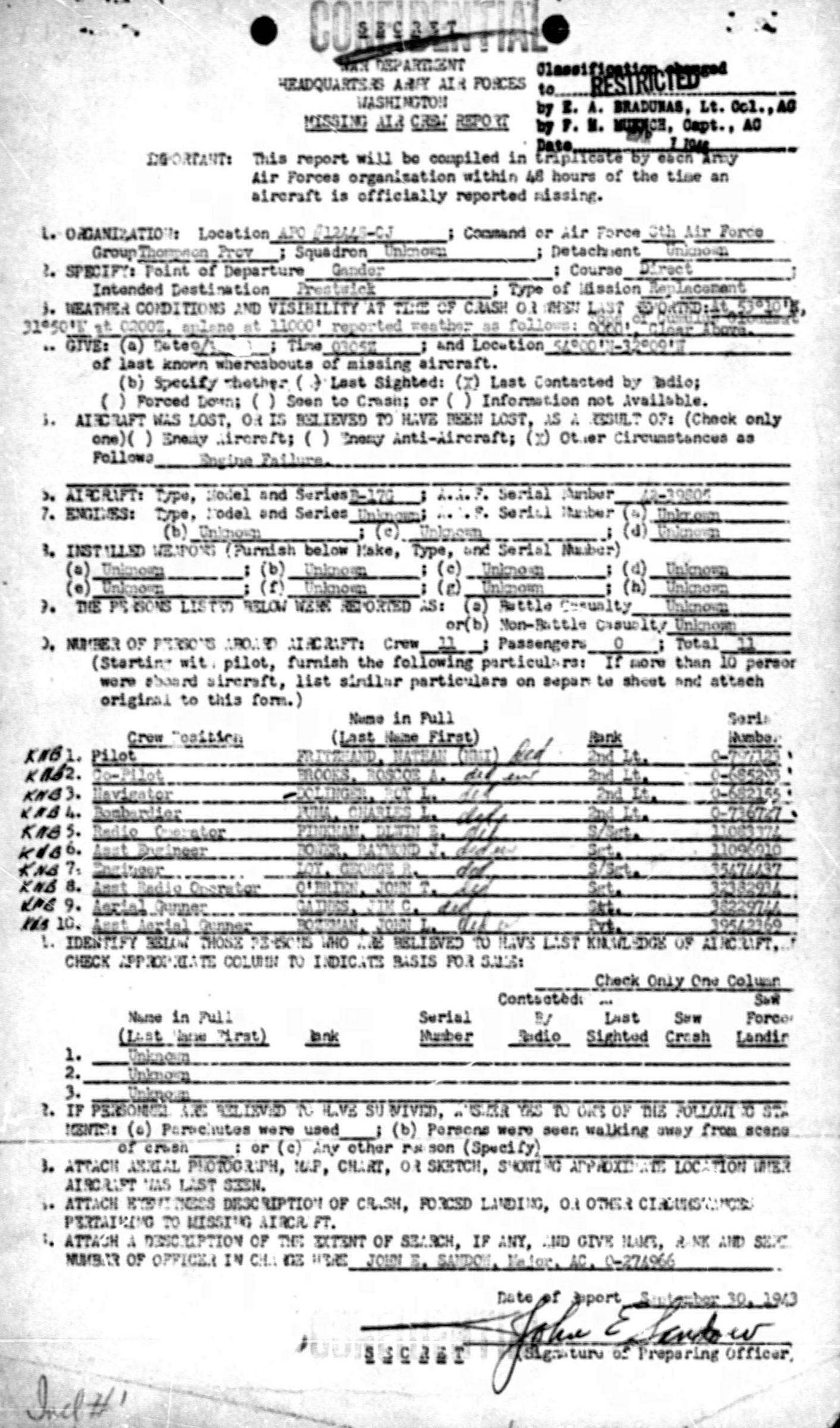 | US ARMY AIR FORCES WORLD WAR II 2nd/Lt. Roy L. Dolinger MIA/KIA Entered the Service from: Virginia Squadron: no specific unit assigned Service #39542369 Awards: Pilot 2nd/Lt. Nathan Fritzhand MIA/KIATarget: Ferry Mission Missing Air Crew Report Details USAAF MACR#: 664 Date Lost: 20-Sep-43 Serial Number: #42-39805 Aircraft Model B-17G Aircraft Letter: Aircraft Name: Location: 775 miles SW from Reykjavík Iceland Cause: Engine Failure 11MIA/KIAThis Ship and crew were lost at sea in transit to EU on the northern route after leaving Iceland. Piloted by 2nd Lt. Fritzhand with Major J.T. Thompson in provisional command. The crew and ship were not recovered.42-39805 (c/n: ) Accepted: 3 September 1943 – Lockheed Aircraft Co (Plant A-1), Burbank, California Assigned: 5 September 1943 – ATC / 6th Ferrying Group – (Long Beach AAF) Assigned: 22 September 1943 – 2nd AF / 17th BTW – 518 HQABSQ (Pilot Training – 4 Engine) – (Grand Island AAF) Replacement crew training – no specific unit assigned Ferried: 30 September 1943 – (RCAF Gander – RAF Presque)(Pilot: 2Lt Nathan Fritzhand) Thompson Provisional Group Ditched (class 5): Thursday, 30 September 1943 @ 0330 hrs (Engine failure) – Atlantic Ocean (775 miles SW from Reykjavík), Reykjavík – Iceland (54°0’0″N / 32°8’59″W) (Pilot: 2Lt Nathan Fritzhand) – 10 KIA (MACR 664) – SOC.The #42-39805 crew 2nd/Lt. Nathan Fritzhand Pilot MIA/KIA 2nd/Lt. Roscoe A. Brooks MIA/KIA 2nd/Lt. Roy L. Dolinger MIA/KIA 2nd/Lt Charles L. Puma MIA/KIA S/Sgt. George R. Loy MIA/KIA S/Sgt. Elwin E. Pinkham MIA/KIA Sgt. Raymond J. Bower MIA/KIA Sgt. Jim C. Gaines MIA/KIA S/Sgt. John T. O’Brien MIA/KIA Pvt. John L. R. Bozeman MIA/KIA Maj. Jack Pershing Thompson MIA/KIA |