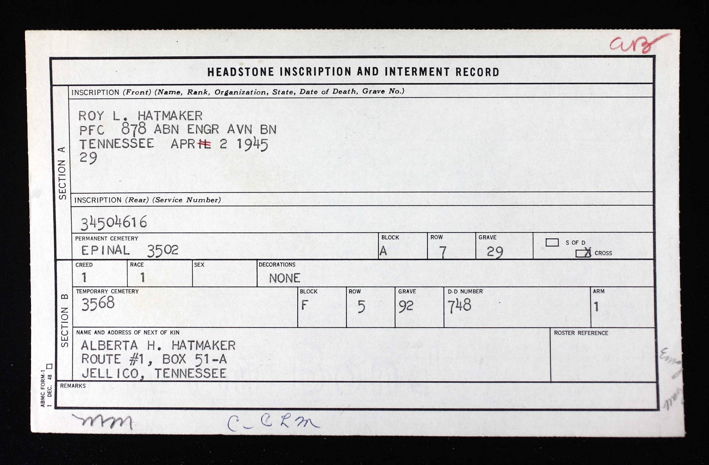 Private First Class Roy L. Hatmaker #34804616 US Army was assigned to the 878th Airborne Engineer Battalion.