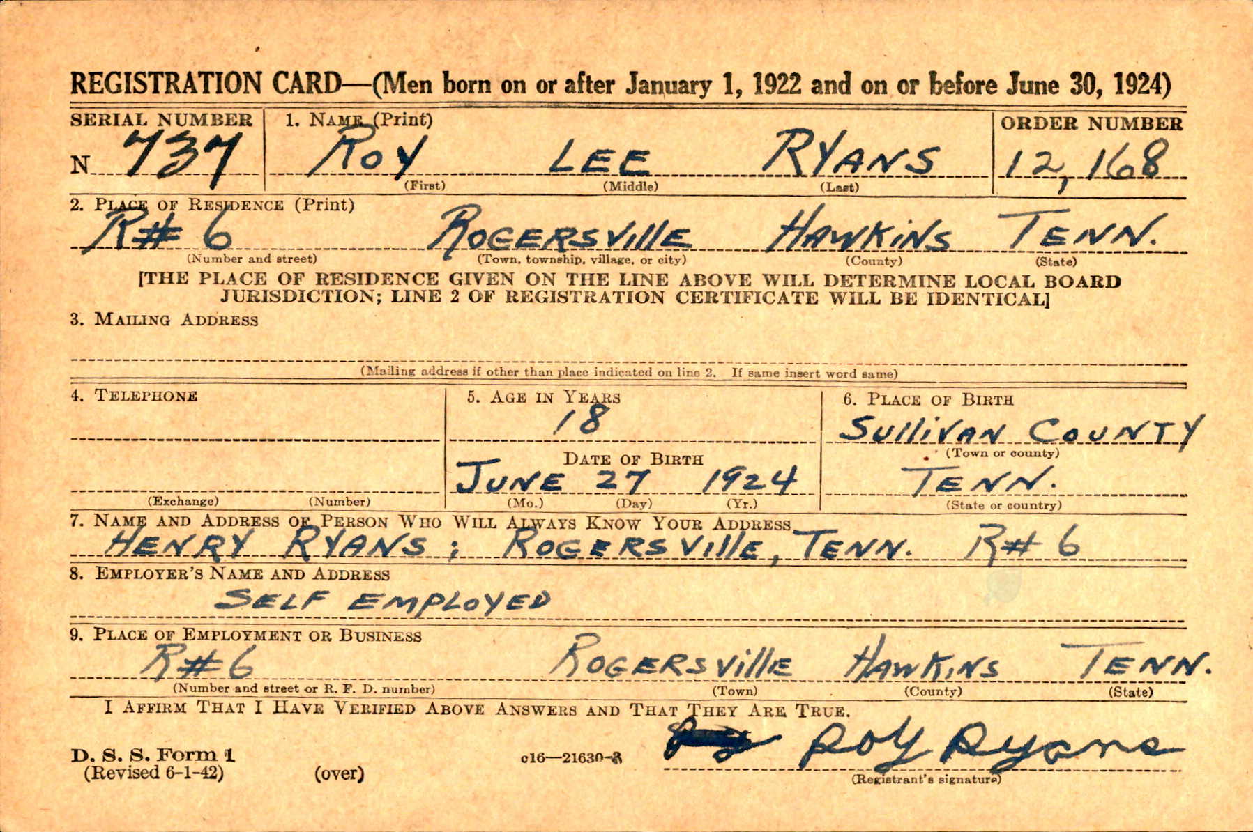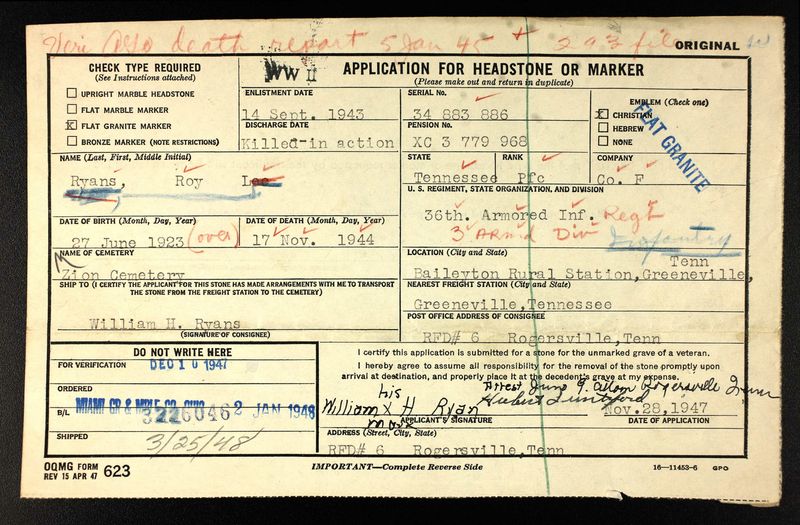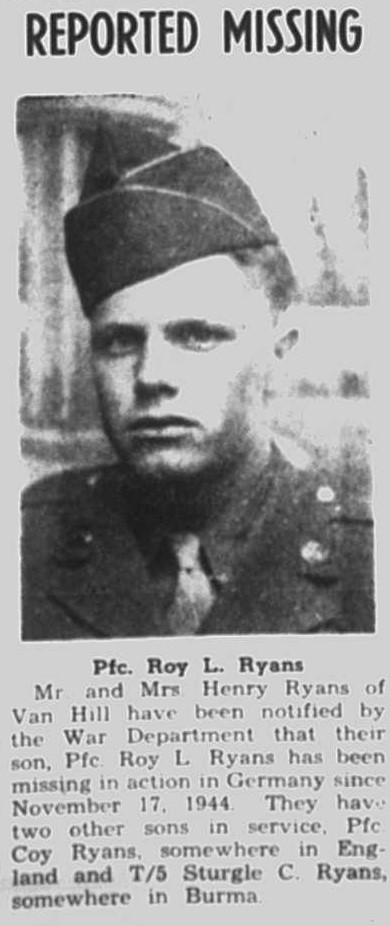 Roy Lee Ryans was born 27 June 1923 to William Henry and Bessie Ryans.