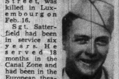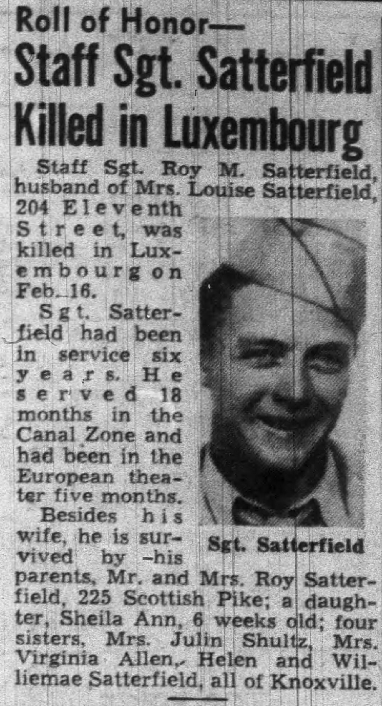 Staff Sgt. Roy M. Satterfield, husband of Mrs. Louise Satterfield, 204 Eleventh Street, was killed in Luxembourg on Feb. 16. Sgt. Satterfield had been in service six years. He served 18 months in the Canal Zone and had been in the European theater five months. Besides his wife, he is survived by his parents, Mr. and Mrs. Roy Satterfield, 225 Scottish Pike; a daughter, Sheila Ann, 6 weeks old; four sisters, Mrs. Julin Shultz, Mrs. Virginia Allen, Helen and Williemae Satterfield, all of Knoxville.