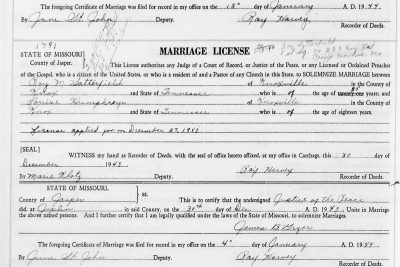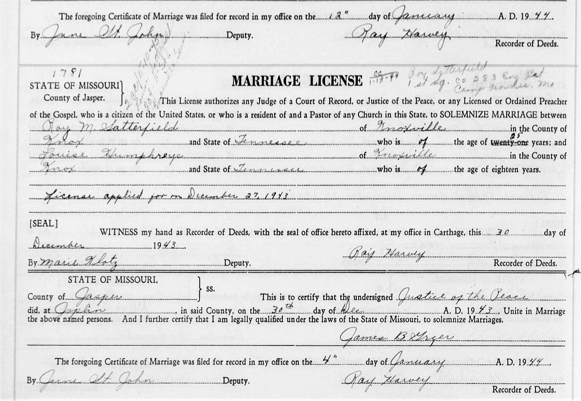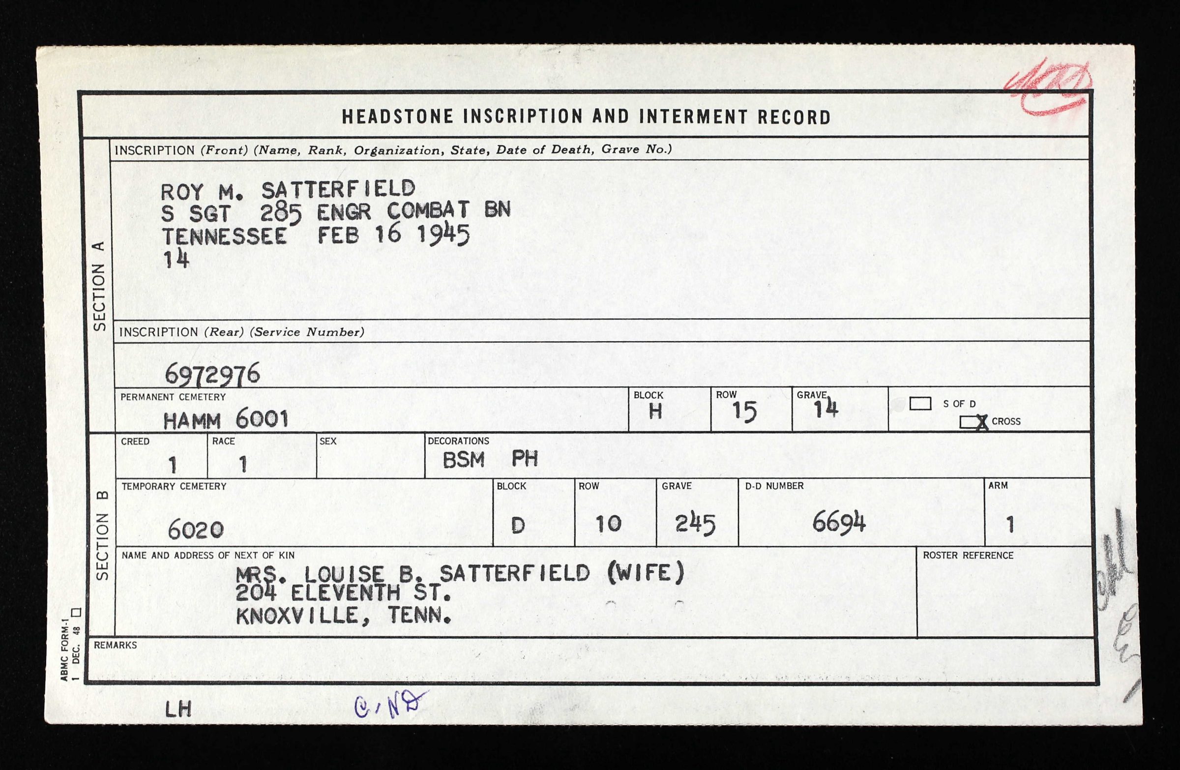 Roy M. Satterfield was born in 1918, son of Roy Lee Satterfield and May McNish. He entered the service on 16 October 1939. He married Louise Bernardine Humphreys on 30 December 1943 in Missouri. At the time of his marriage he was stationed at Camp Crowder in Missouri.