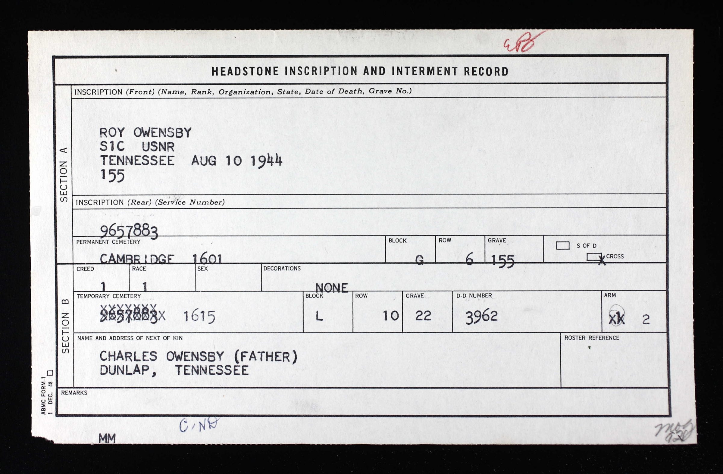 He is buried at Cambridge American Cemetery, England, G, 6, 15.