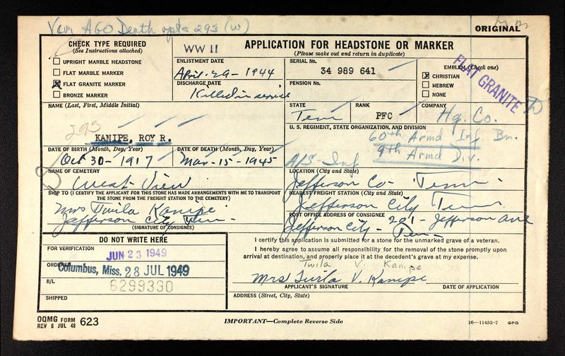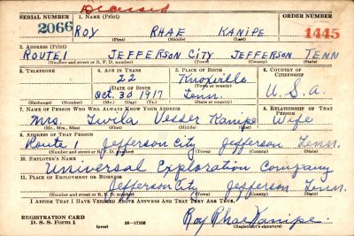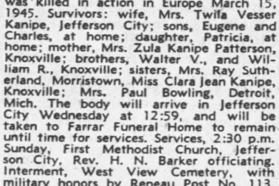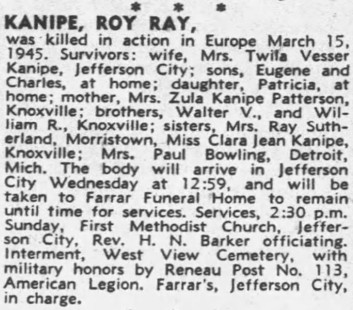 Roy Ray Kanipe was killed in action in Europe March 15, 1945. Survivors: wife, Mrs. Twila Vesser Kanipe, Jefferson City; sons, Eugene and Charles, at home; daughter, Patricia, at home; mother, Mrs. Zula Kanipe Patterson, Knoxivlle; brothers, Walter V., and William R., Knoxville; sisters, Mrs. Ray Sutherland, Morristown, Miss Clara Jean Kanipe, Knoxville; Mrs. Paul Bowling, Detroit, Mich.