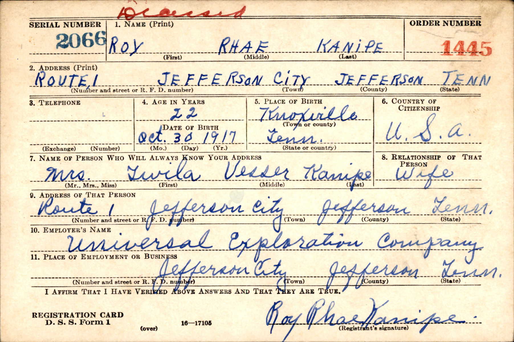 Roy Rhae Kanipe was born on 30 October 1917 at Knoxville, Tennessee