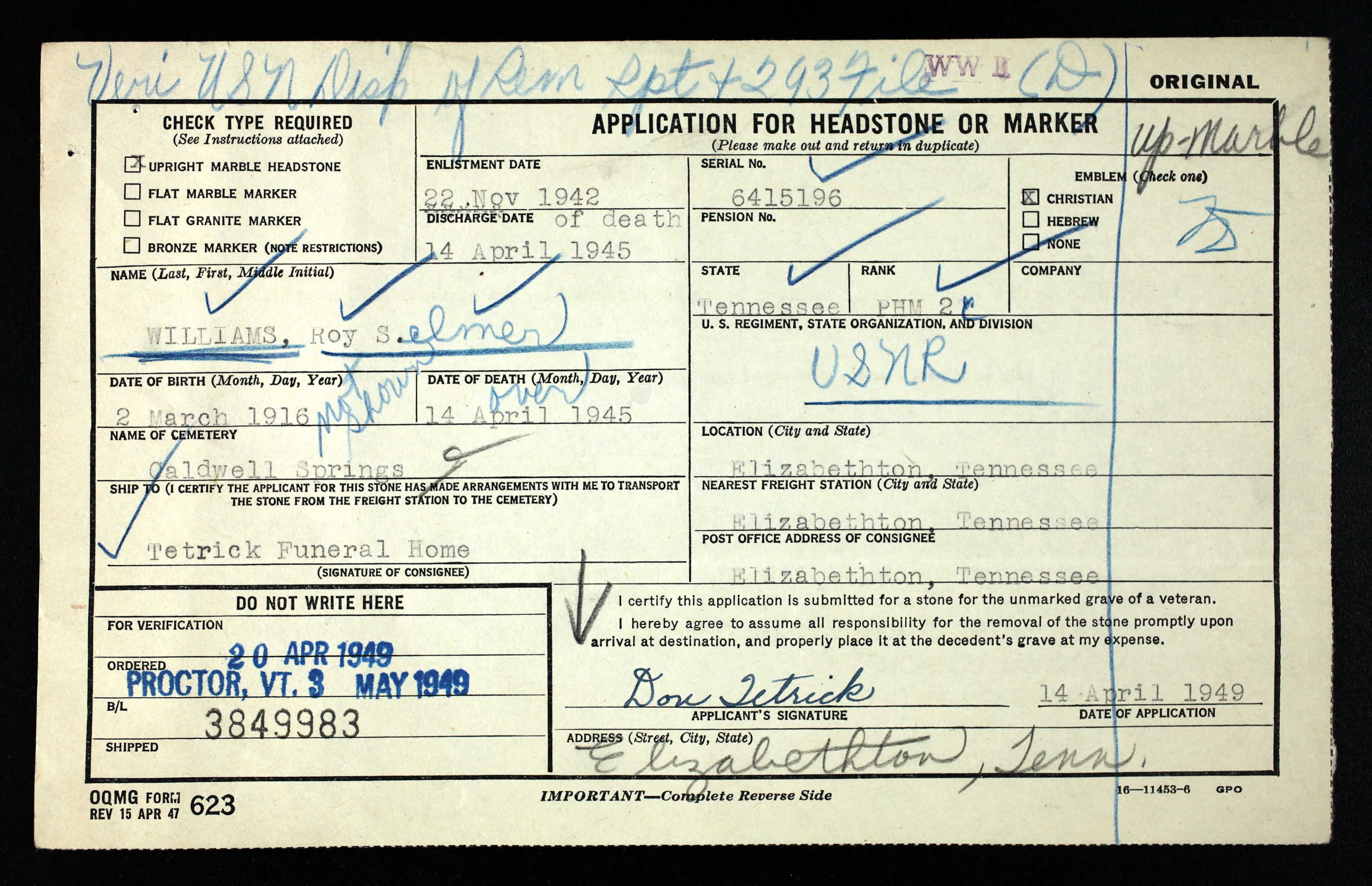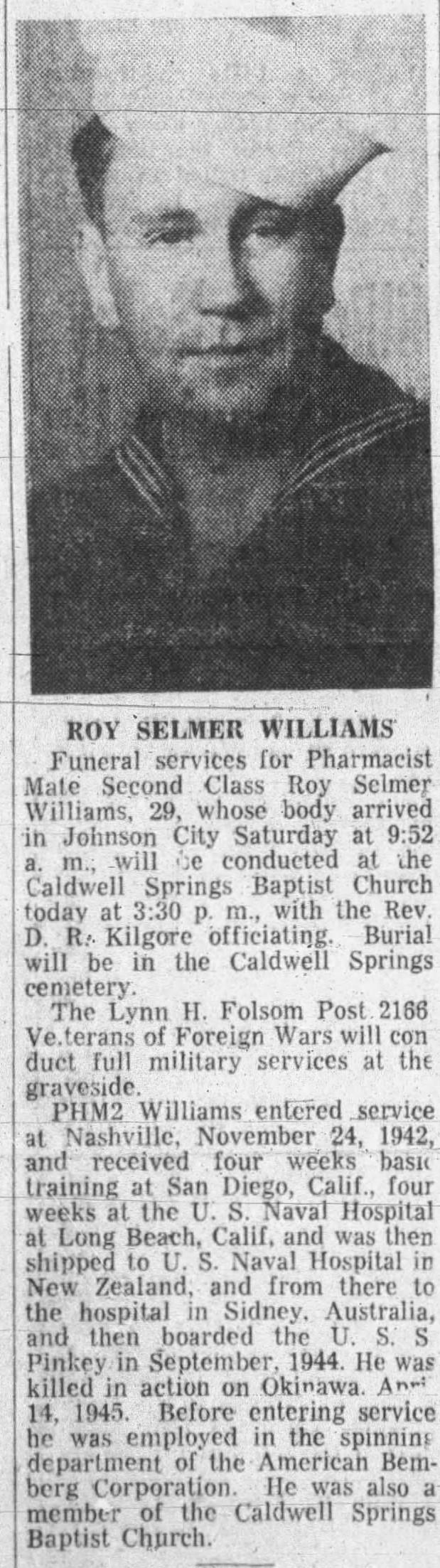 Funeral services for Pharmacist Mate Second Class Roy Selmer Williams, 29, whose body arrived in Johnson City will be conducted at the Caldwell Springs Baptist Church. Burial will be in the Caldwell Springs cemetery.