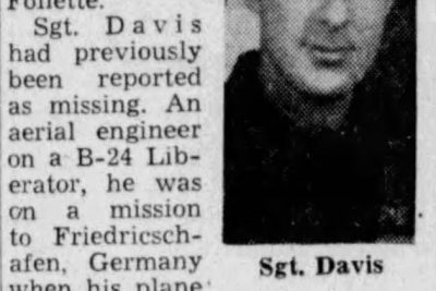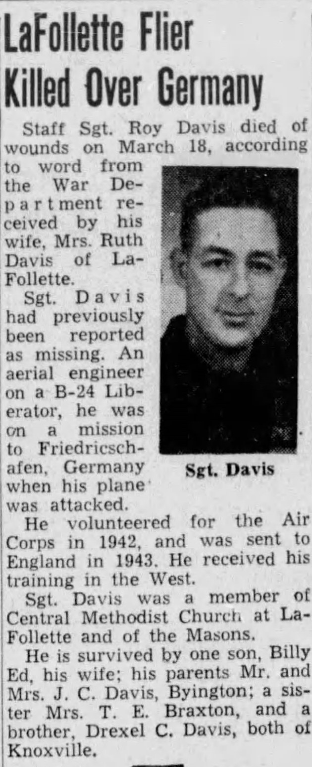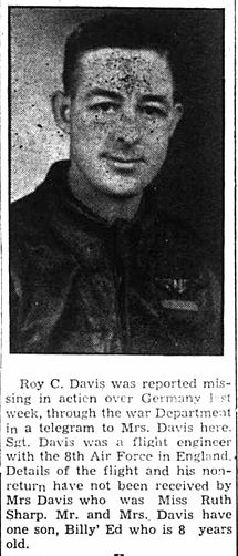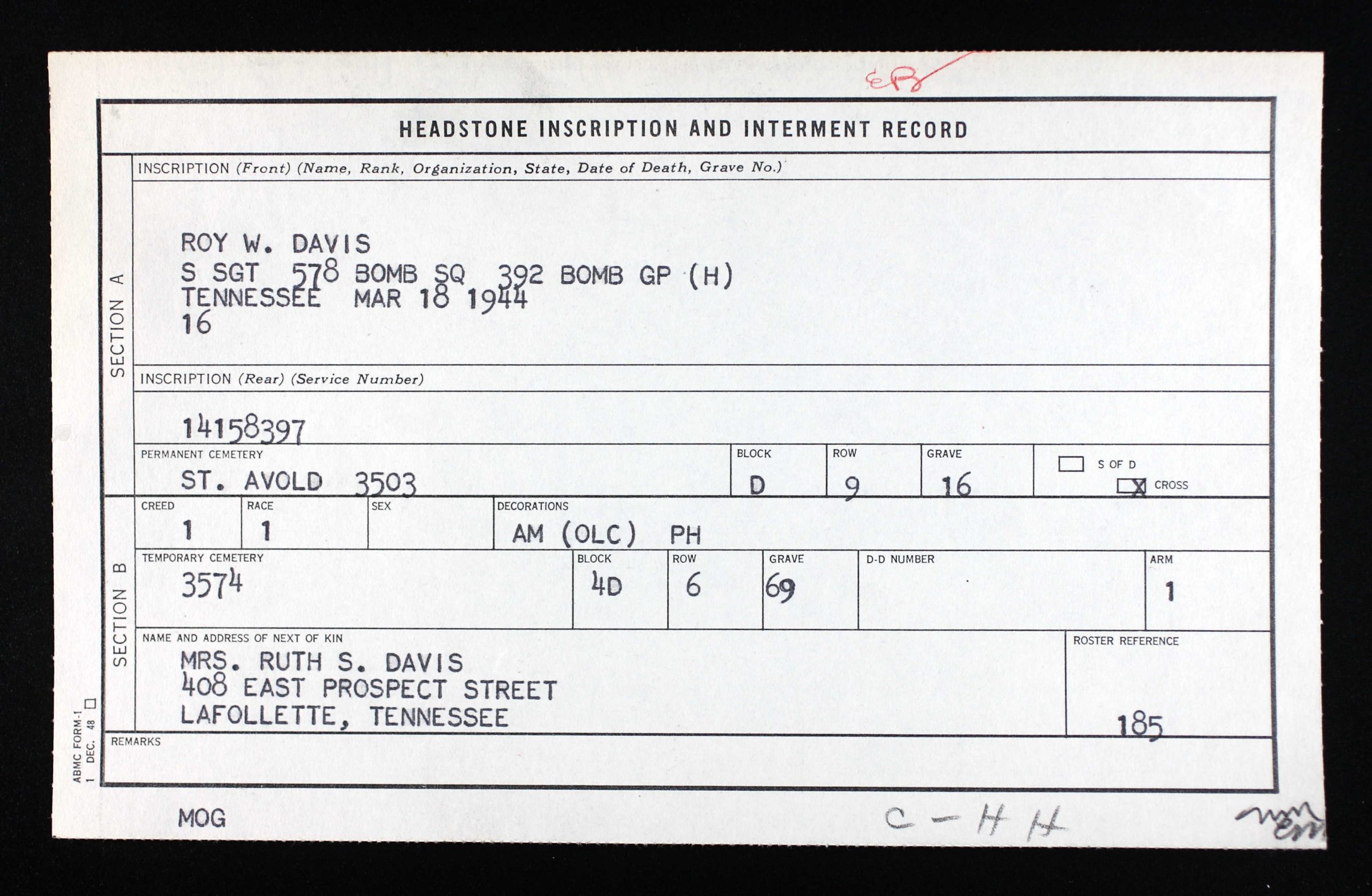 Staff Sergeant Roy W. Davis, US Army Air Forces, was assigned to the 578th Bombardment Squadron, 392nd Bomber Group Heavy. The unit flew B-24’s out of Wendling, England against the Germans in the European Theater of operations.