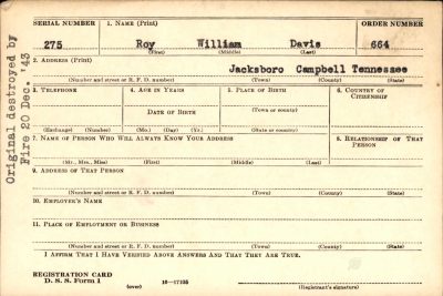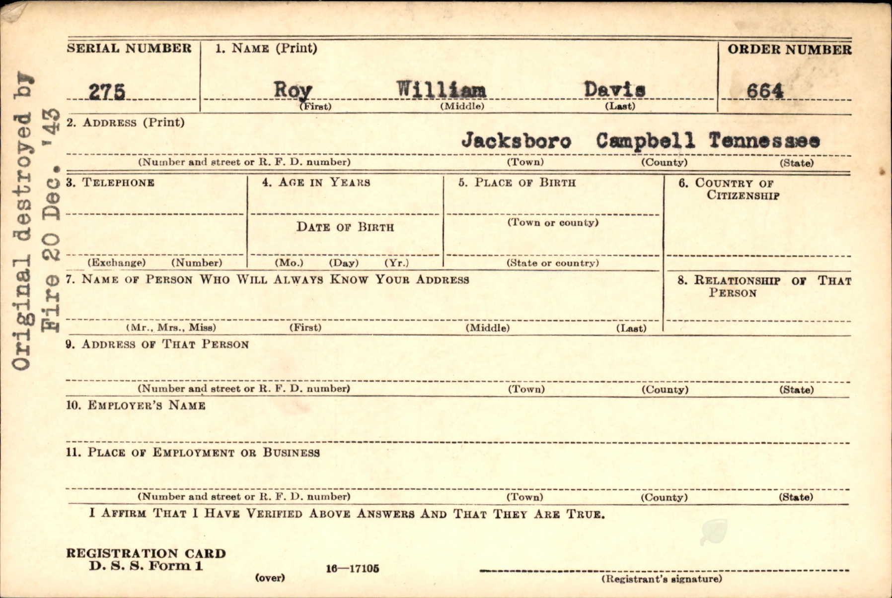 Roy William Davis was the son of John Calvin Davis and Ida Bell Drake. He married Josie Ruth Sharp on 13 November 1934.