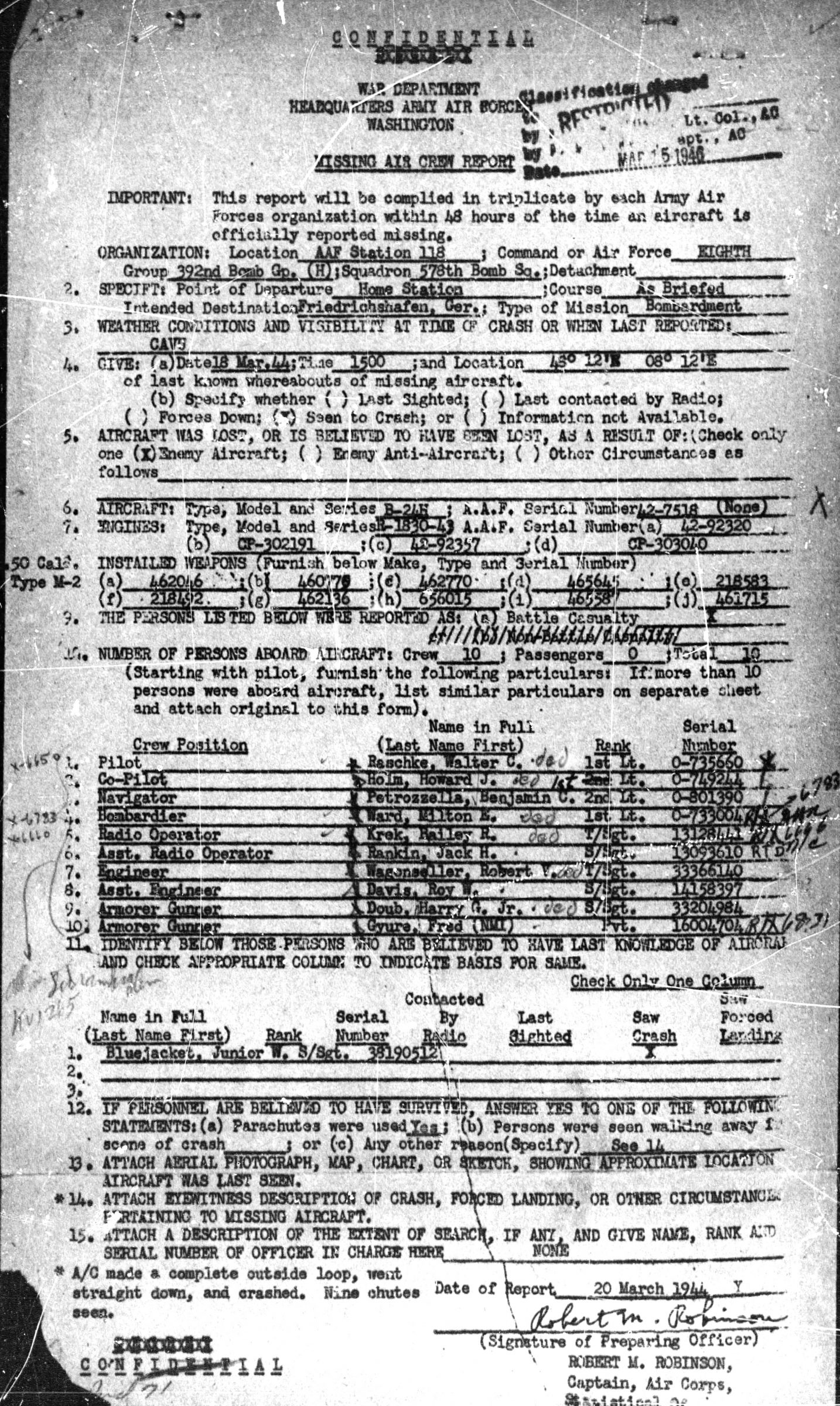 - Division/Assignment: 578th Bombardment Squadron, 392nd Bomber Group, Heavy