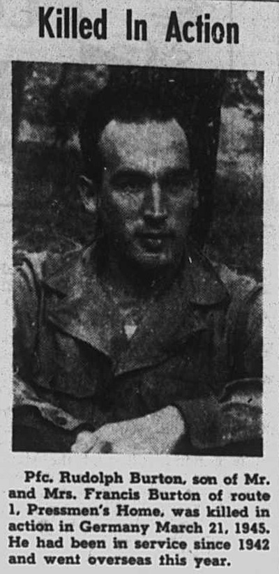 Pfc. Rudolph Burton, son of Mr. and Mrs. Francis Burton of route 1, Pressmen’s Home, was killed in action in Germany March 21, 1945. He had been in service since 1942 and went overseas this year.