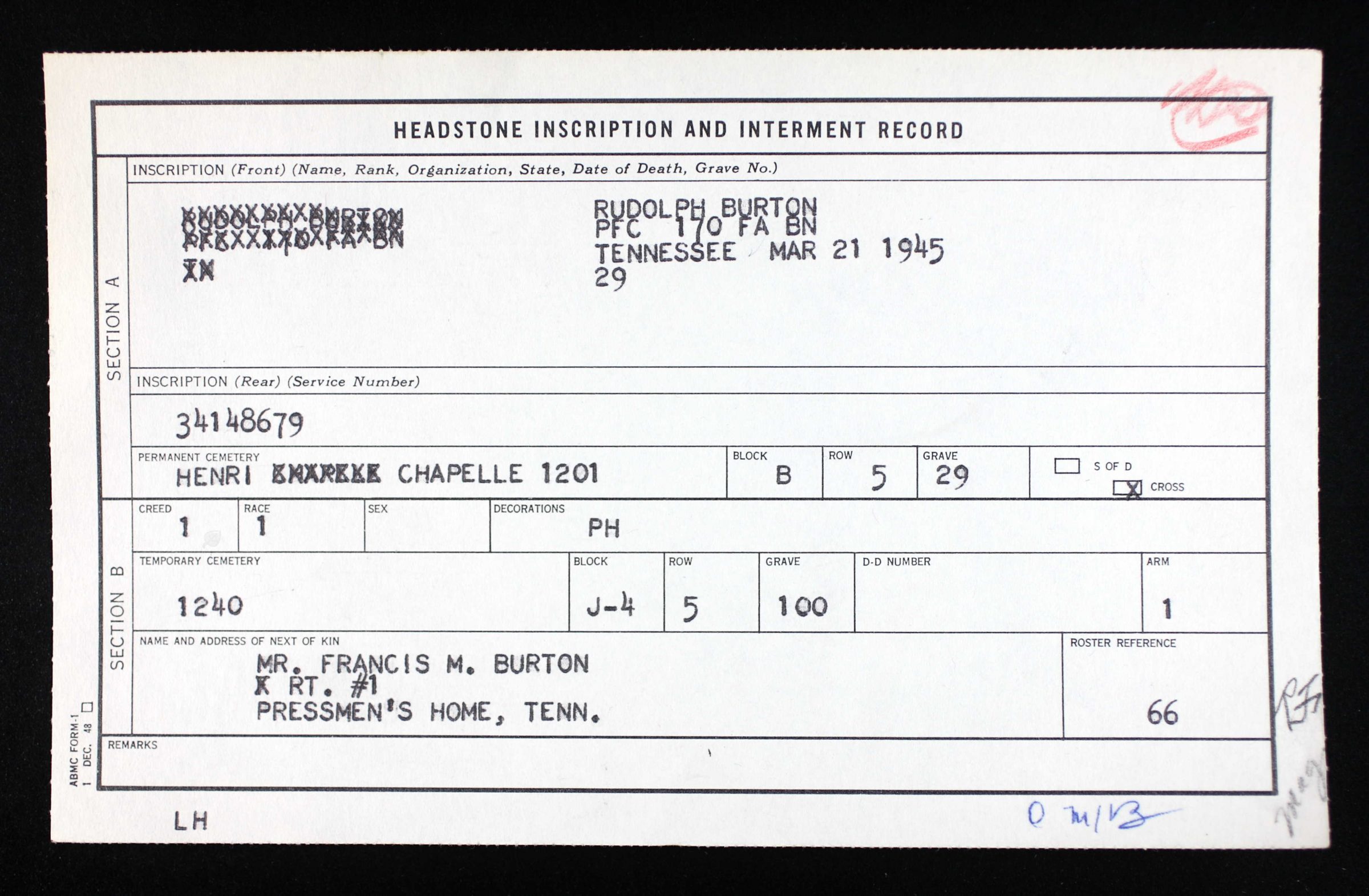 Private First Class Rudolph Burton was assigned to the 170th Field Artillery Battalion attached to the 9th Infantry Division. At the time of his death the 9th Division had captured the bridge at Remagen and had crossed the Rhine River established a new front and was proceeding in all directions into Germany from the bridgehead.