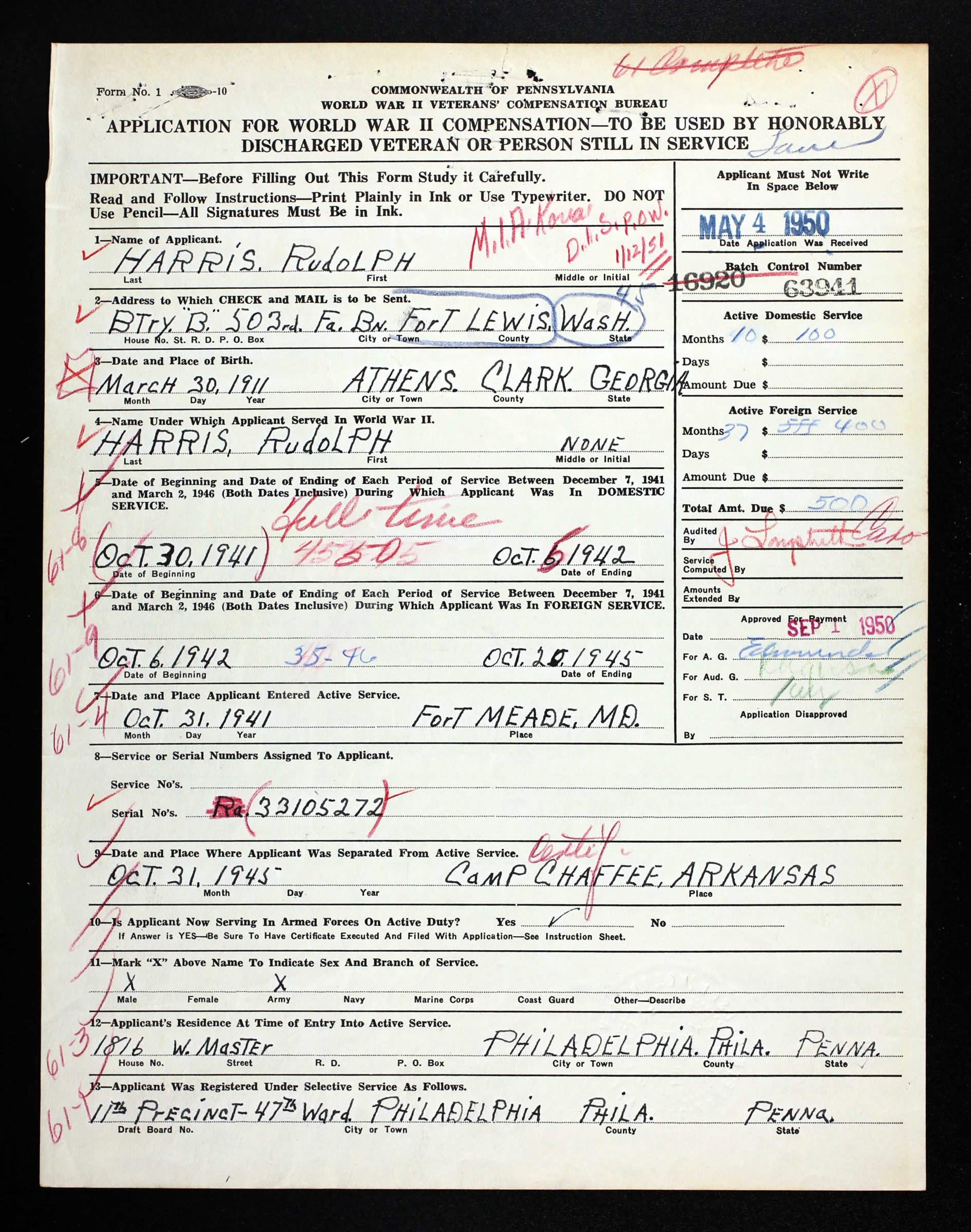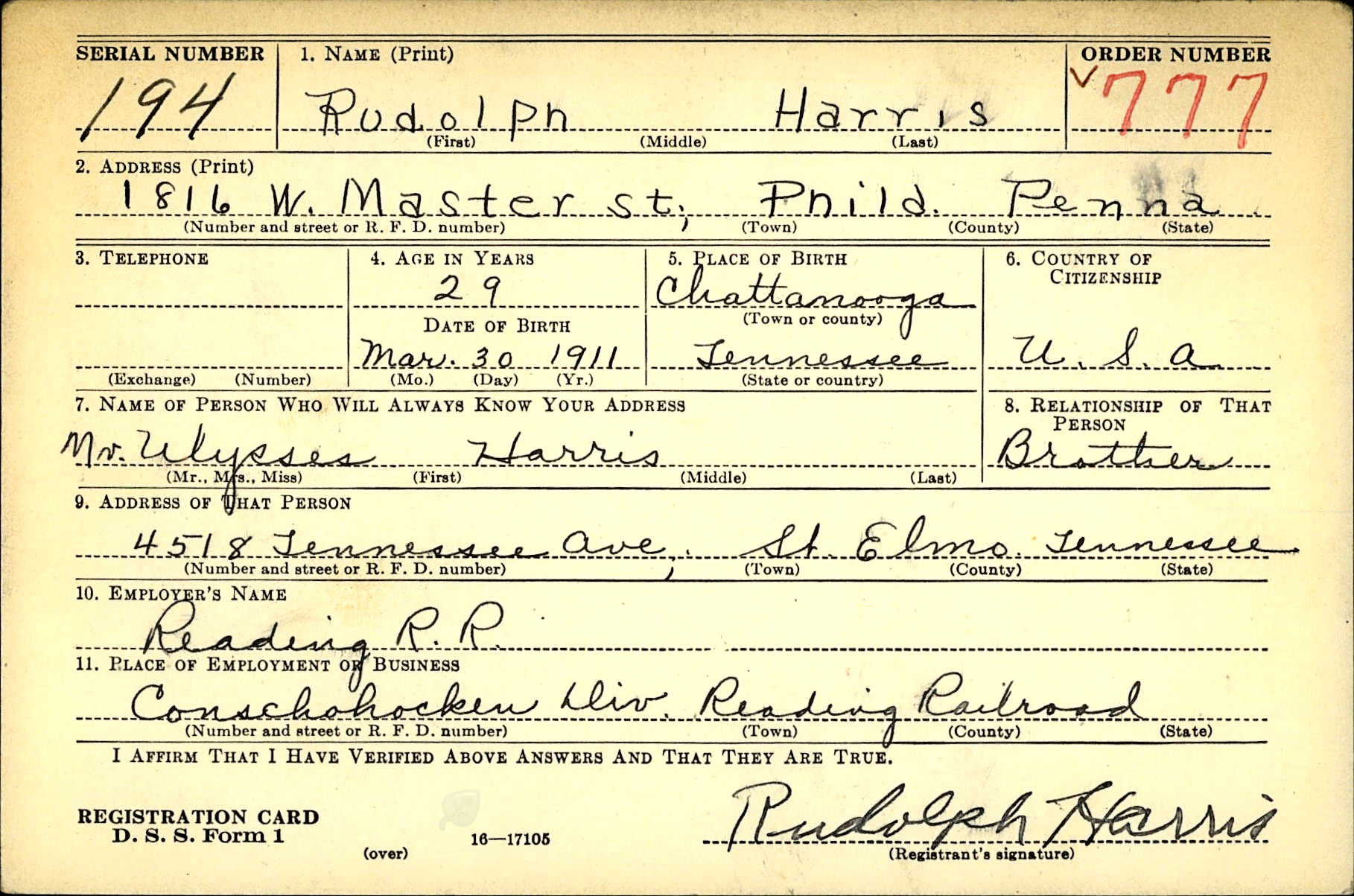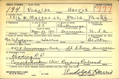 Rudolph Harris was born at Athens, Georgia to Richard Harris and Addie Sheets. He was married to Lois L. Dodson and had a son, Williard Harris. He and wife and son were residing in Philadelphia, Pennsylvania.