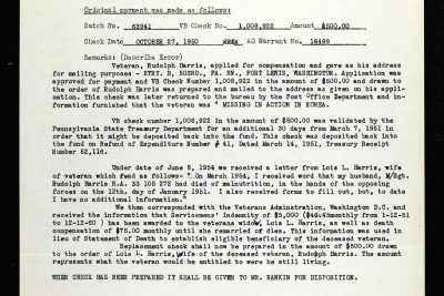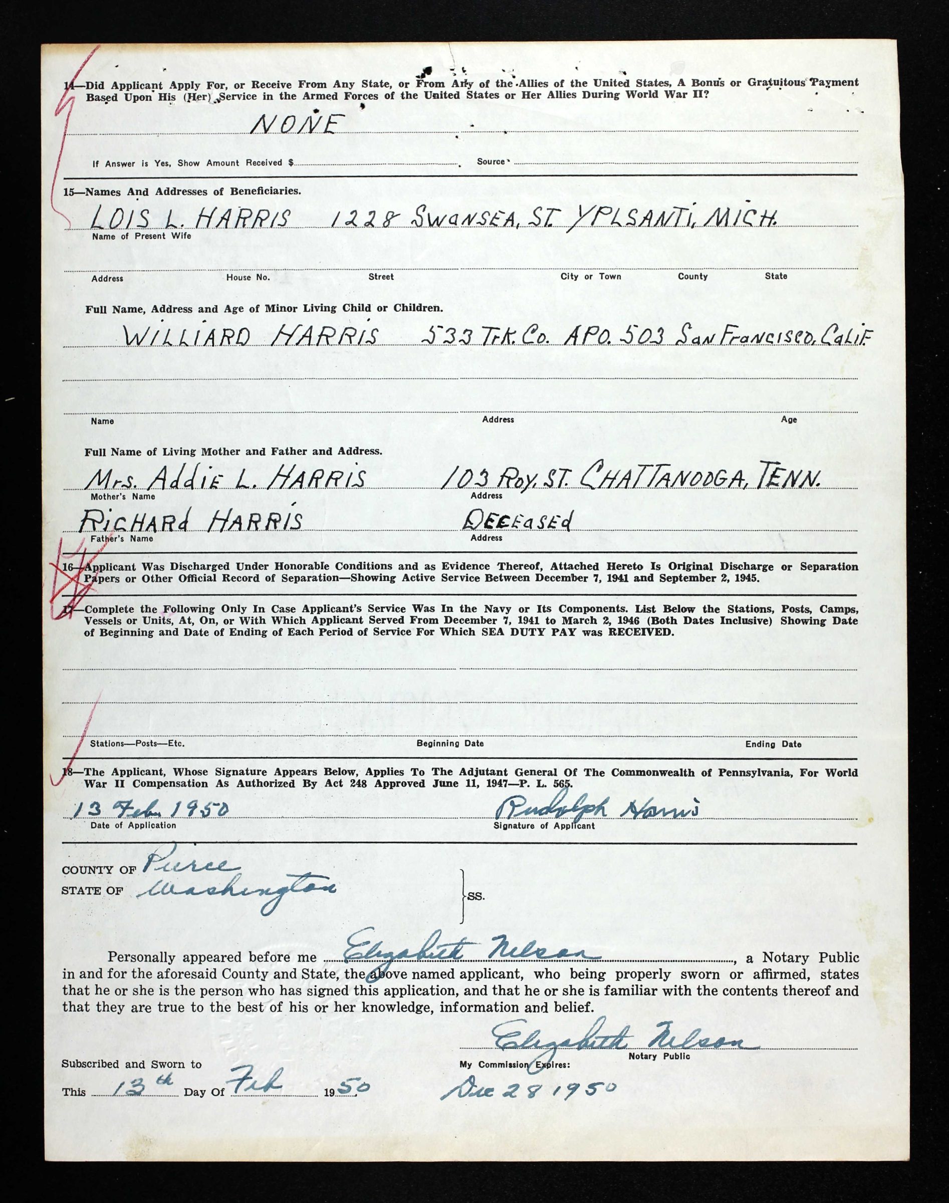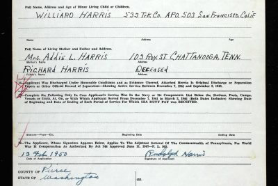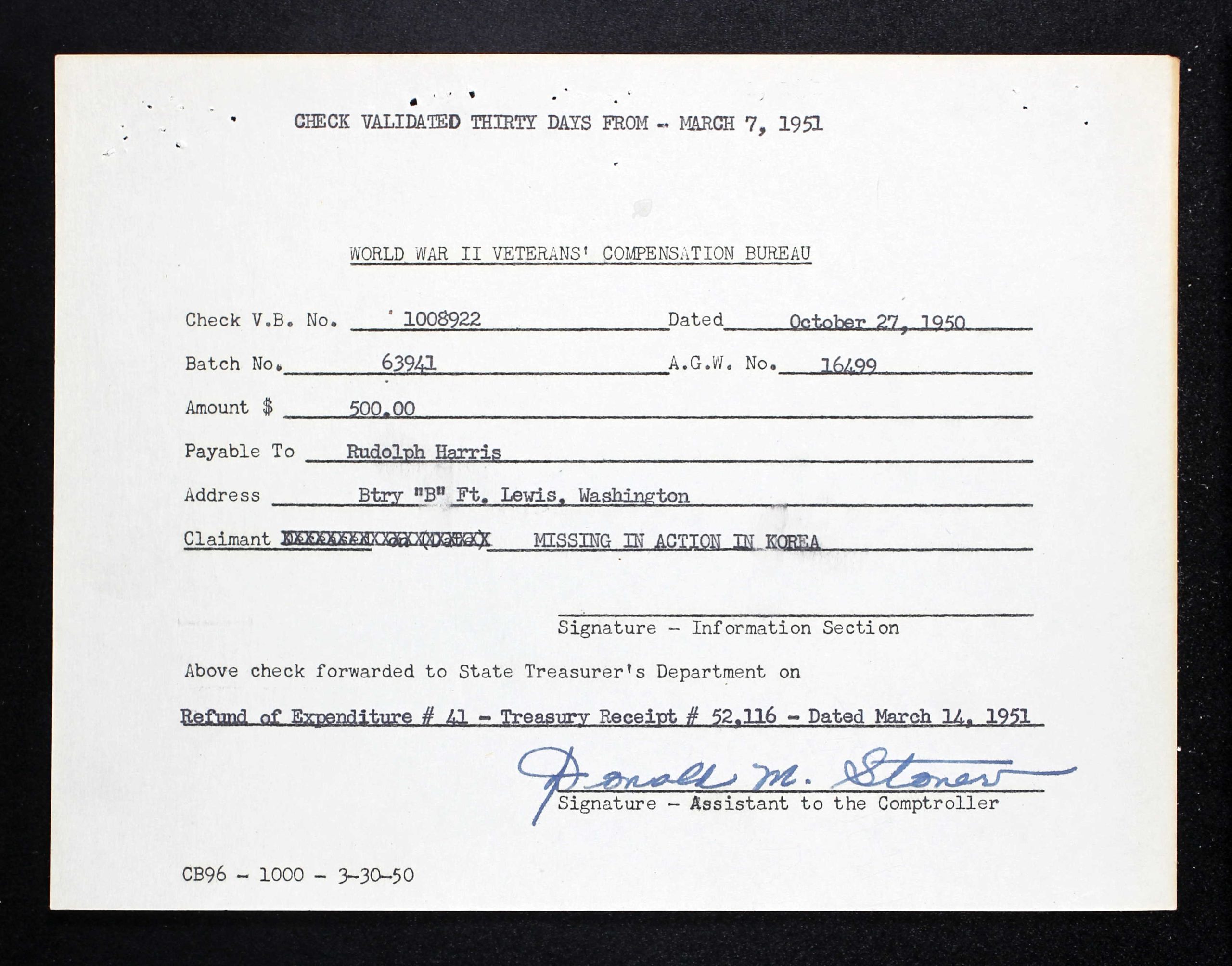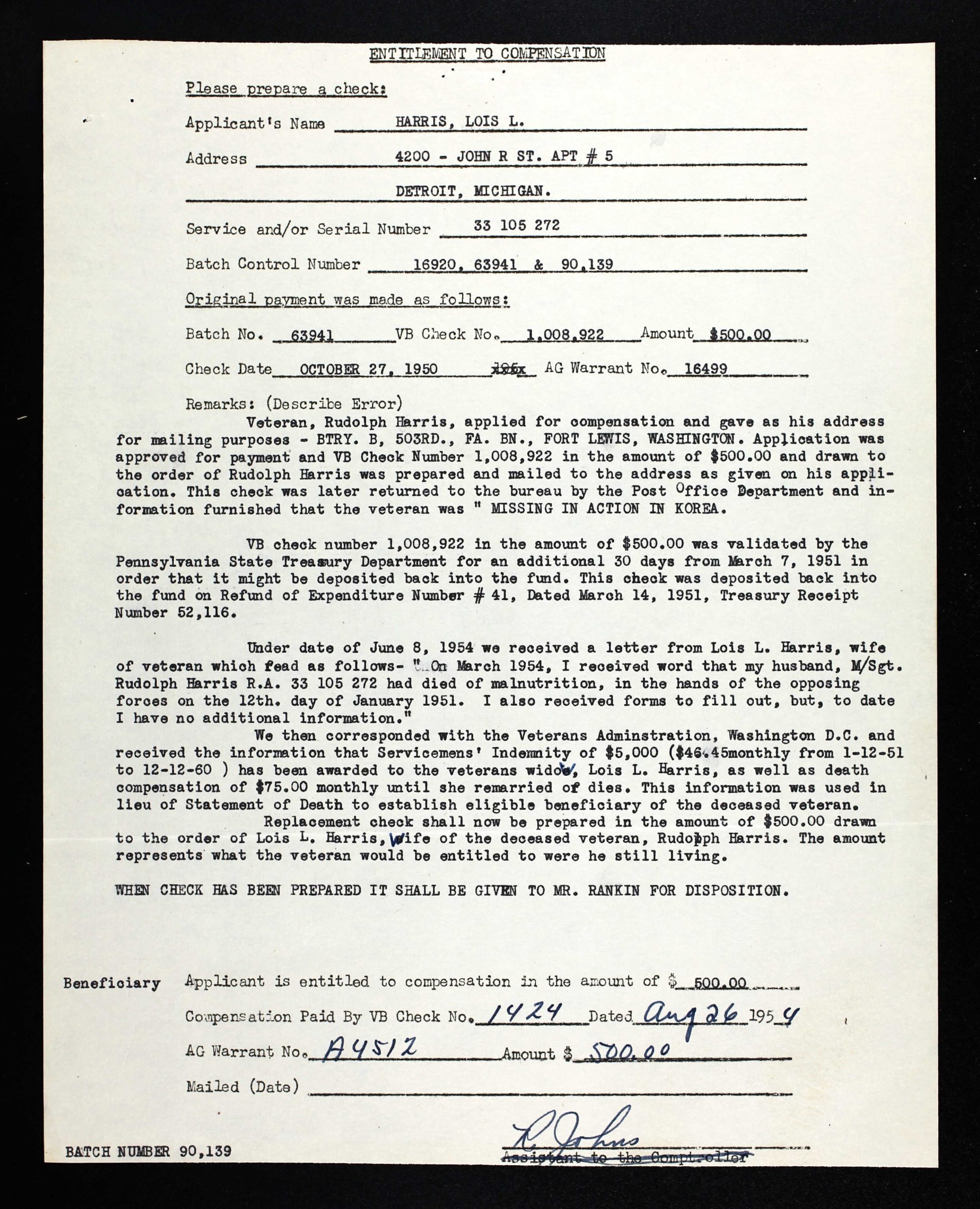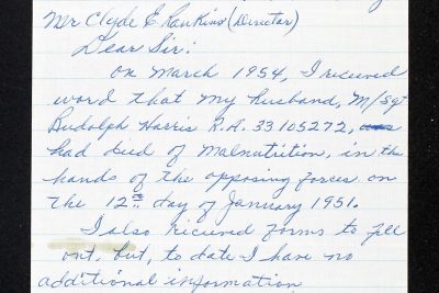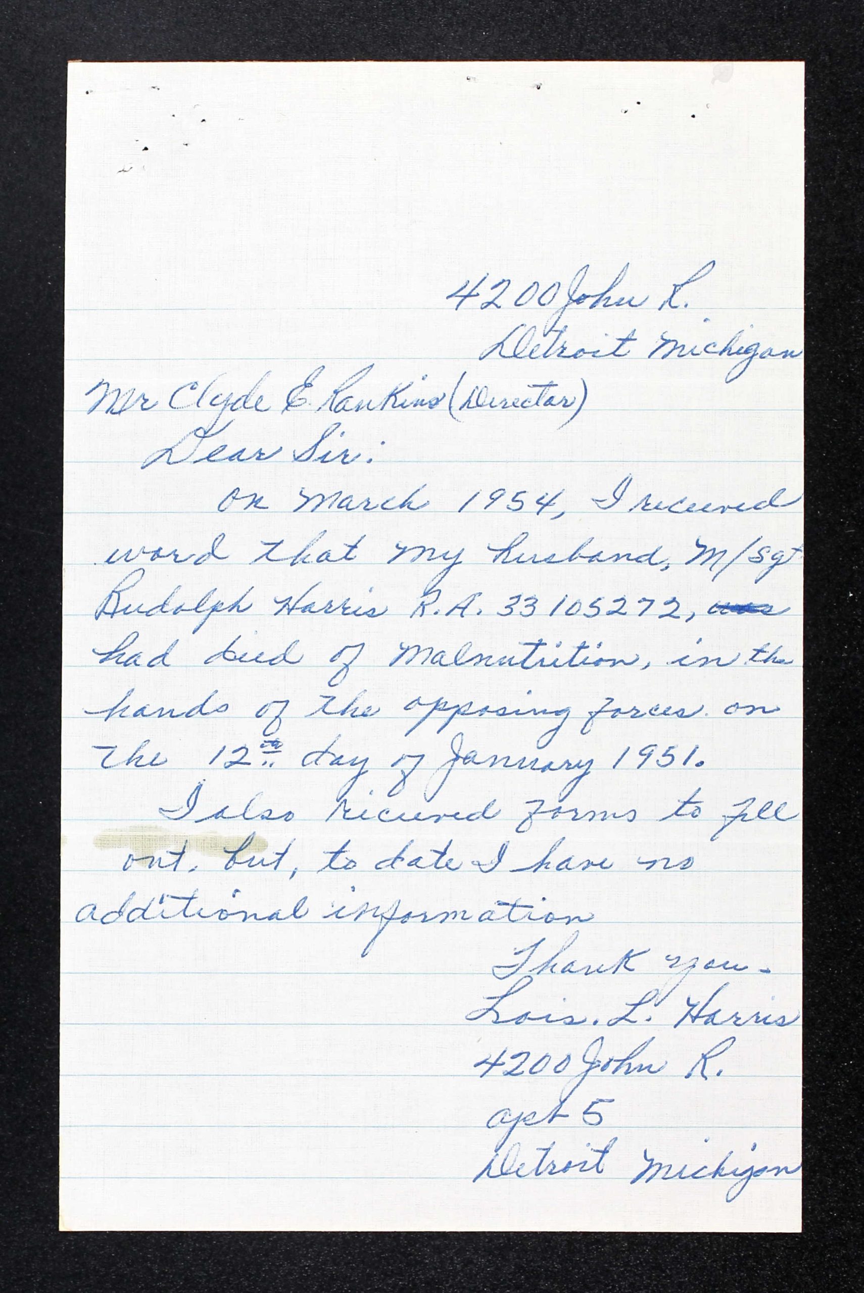 Master Sergeant Harris was a veteran of World War II. In Korea, he was a member of Battery B, 503rd Field Artillery, 2nd Infantry Division. He was taken Prisoner of War while fighting the enemy near Kunu-ri, North Korea on December 1, 1950 and died of malnutrition while a prisoner. His remains were not recovered. His name is inscribed on the Courts of the Missing at the Honolulu Memorial.