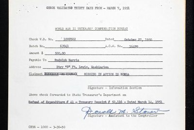 - Awards: Prisoner of War Medal, Korean Service Medal, United Nations Service Medal, National Defense Service Medal, Korean Presidential Unit Citation, Republic of Korea War Service Medal, and the World War II Victory Medal