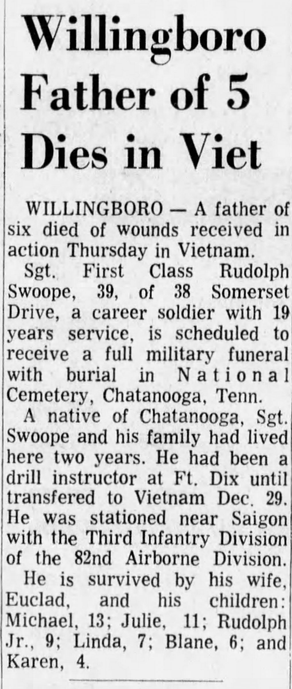 Sergeant First Class Rudolph Swoope was born on July 16, 1928, and was originally from Chicago, Ilinois. He served his country in the Vietnam War in the United States Army, as an infantryman in D Company, 1st Battalion, 505th Infantry, 82nd Airborne Division. He began his tour in Vietnam on December 29, 1968. Less than two months later, on February 27, 1969, SFC Swoope was killed in a gun battle in Binh Duong province, South Vietnam. He was 40 years old at the time of his death. SFC Swoope is buried at Chattanooga National Cemetery in Chattanooga, Tennessee, and is memorialized on the Vietnam Veterans Memorial on Panel 31W, Line 86. The following is a tribute to SFC Swoope: