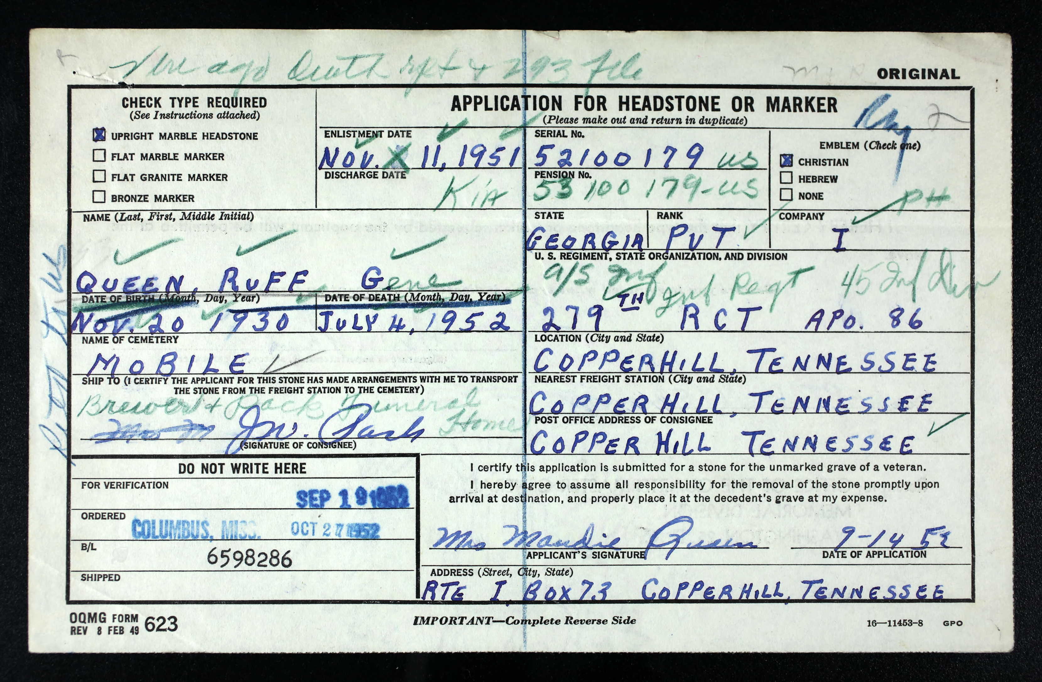 Private Ruff Gene Queen was a member of the 279th Infantry Regiment, 45th Infantry Division. He was Killed in Action while fighting the enemy in North Korea on July 4, 1952. Private Queen was awarded the Purple Heart, Bronze Star, the Combat Infantrymans Badge, the Korean Service Medal, the United Nations Service Medal, the National Defense Service Medal, the Korean Presidential Unit Citation and the Republic of Korea War Service Medal.