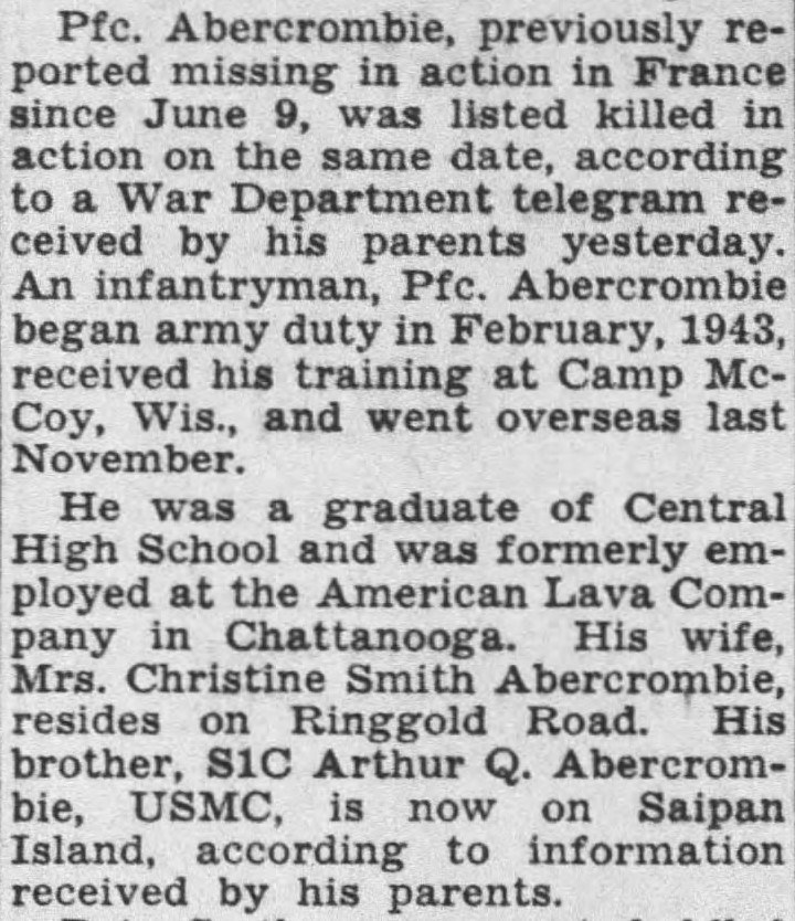 Pfc. Abercrombie, previously reported missing in action in France since June 9, was listed killed in action on the same date, according to a War Department telegram received by his parents. An infantryman, Pfc. Abercombie began army duty in February 1943, received his training at Camp McCoy, Wis., and went overseas in November. He was a graduate of Central High School and was formerly employed at the American Lava Company in Chattanooga. His wife, Mrs. Christine Smith Abercrombie, resides on Ringgold Road. His brother, S1C Arthur Q. Abercrombie, USMC, is now on Saipan Island, according to information received by his parents.