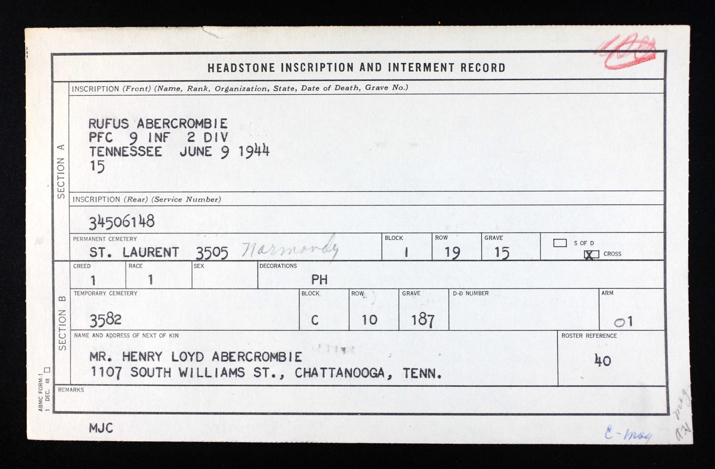 Rufus Abercrombie was born in 1923 in Georgia to Henry Lloyd Abercrombie and Ethel Fuller. He enlisted on 16 January 1943 at Ft Oglethorpe in Georgia. He is buried at the Normandy American Cemetery in St-Laurent, France, Grave I, 19, 15.