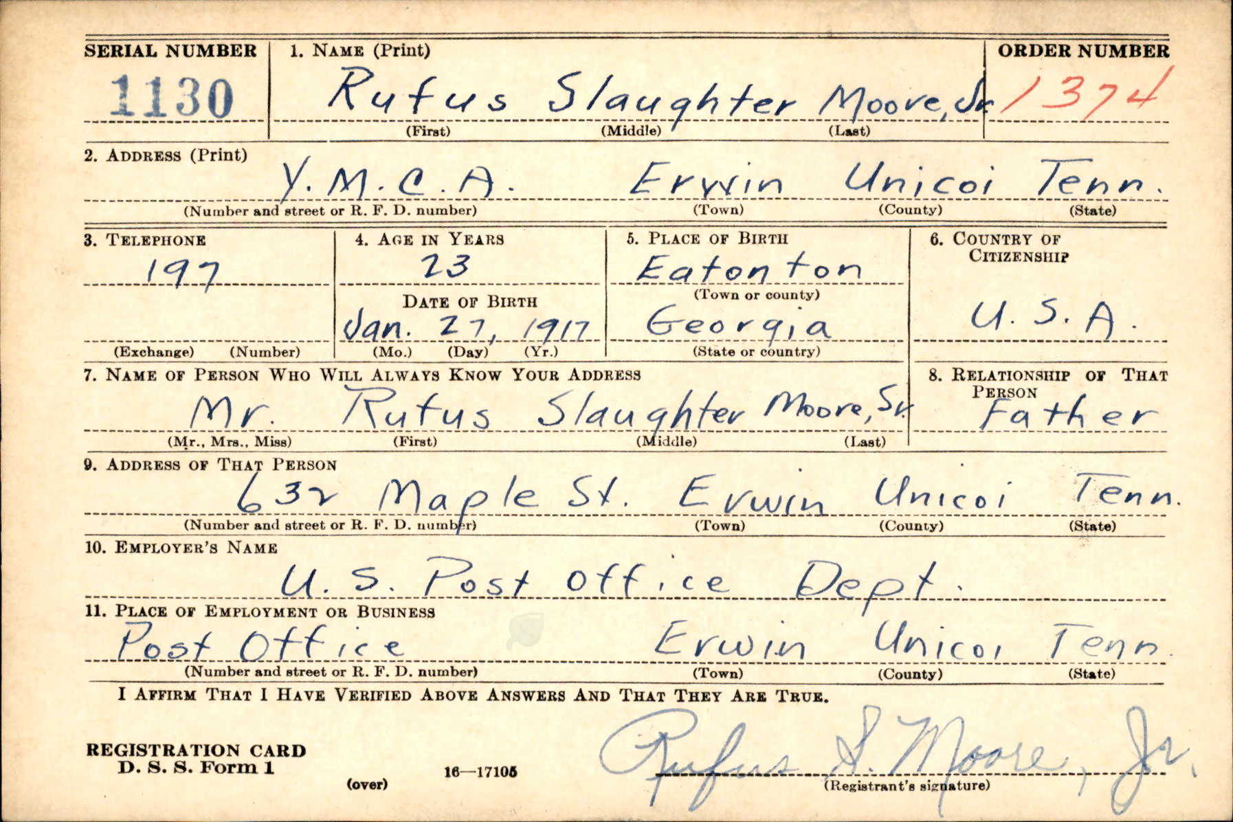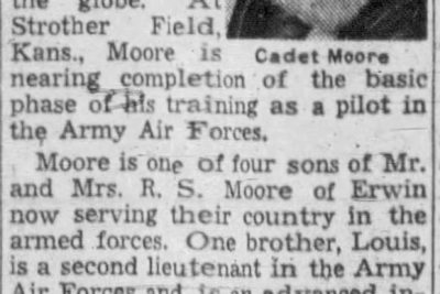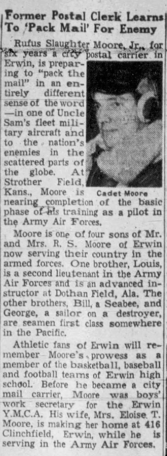 Rufus Slaughter Moore Jr., for six years a city postal carrier in Erwin, is preparing to “pack the mail” in an entirely different sense of the word – in one of Uncle Sam’s fleet military aircraft and to the nation’s enemies in the scattered parts of the globe. At Strother Field, Kans., Moore is nearing his completion of the basic phase of his training as a pilot in the Army Air Forces. Moore is one of four sons of Mr. and Mrs. R.S.Moore of Erwin now serving their country in the armed forces. One brother, Louis, is a second lieutenant in the Army Air Forces and is an advanced instructor at Dothan Field, Ala. The other brothers, Bill, a Seabee, and George, a sailor on a destroyer, are seaman first class somewhere in the Pacific. Athletic fans of Erwin will remember Moore’s prowess as a member of the basketball, baseball and football teams of Erwin high school. Before he became a city mail carrier, Moore was boys’ work secretary for the Erwin Y.M.C.A. His wife, Mrs. Eloise T. Moore, is making her home at 416 Clinchfield, Erwin, while he is serving in the Army Air Forces.