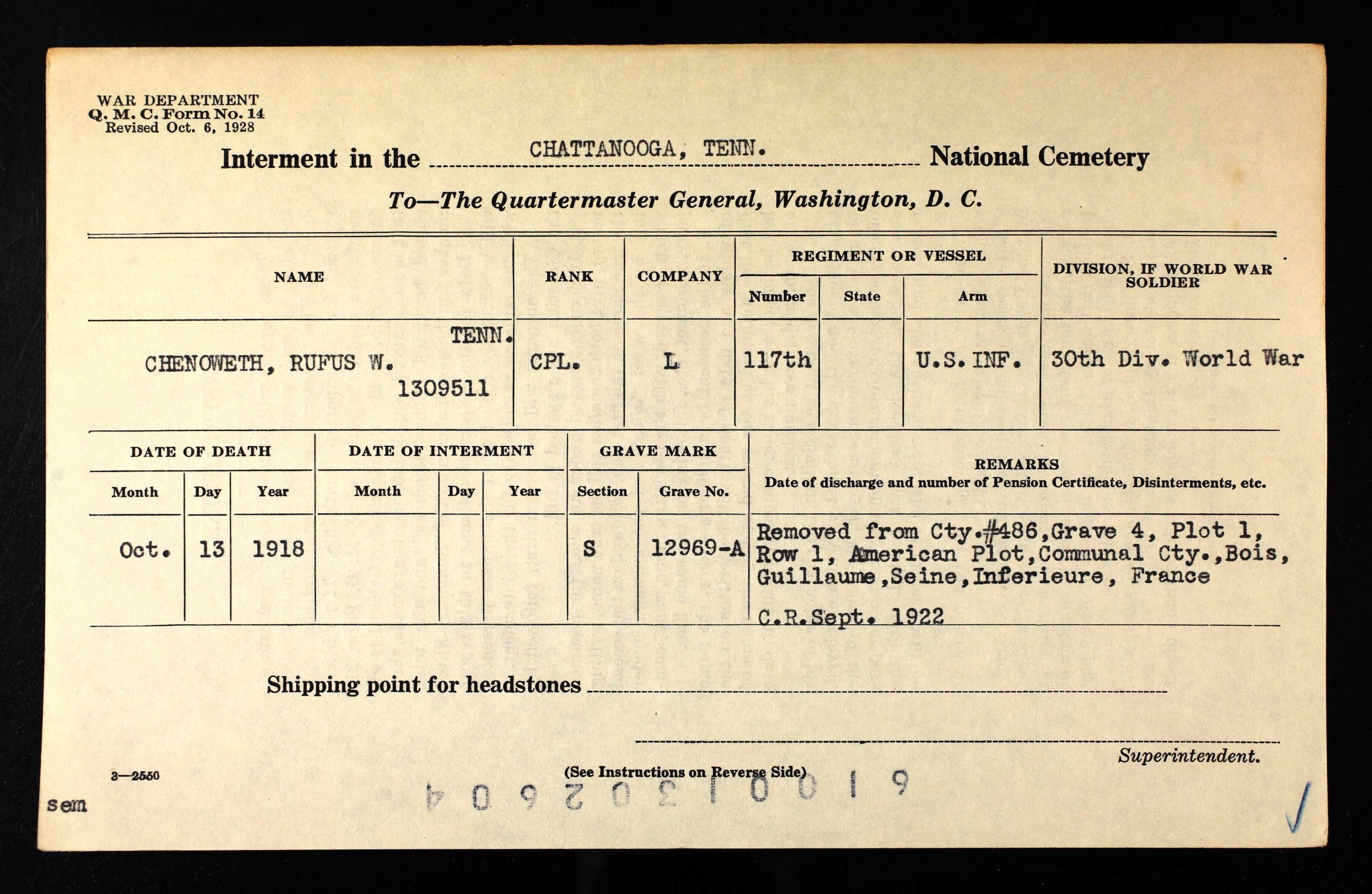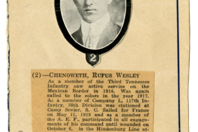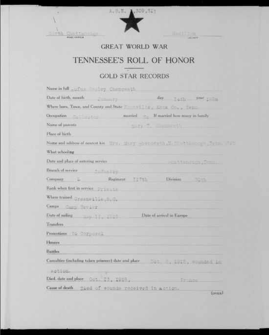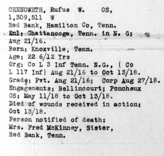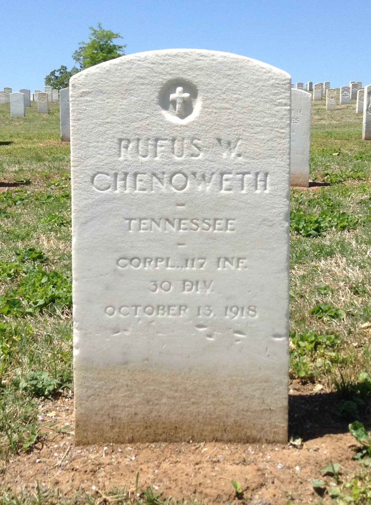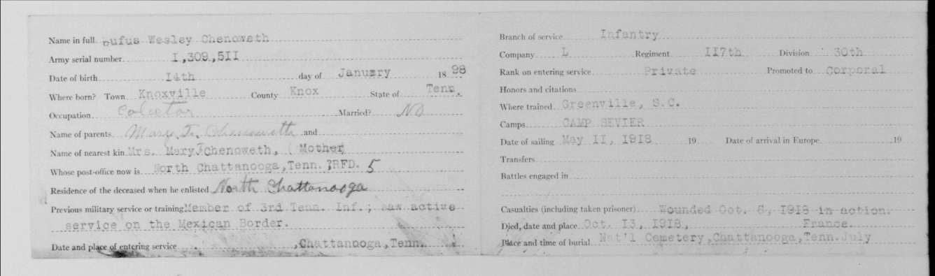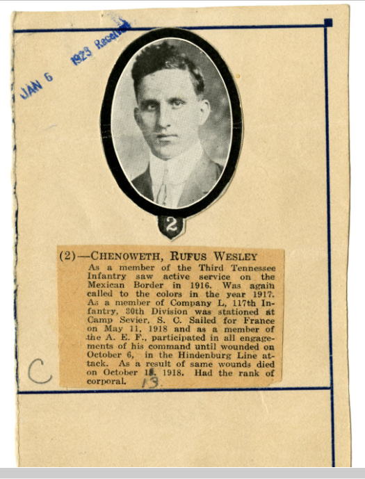 Rufus Wesley Chenoweth as a member of the Third Tennessee Infantry saw active service on the Mexican Border in 1916. Was again called to the colors in 1917. As a member of Company L, 117th Infantry, 30th Division was stationed at Camp Sevier, SC. Sailed for France May 11, 1918, and as a member of the American Expeditionary Force (AEF), participated in all engagements of his command until wounded on October 6 in the Hindenburg Line attack. As a result of same wounds died on October 13, 1918. Had the rank of corporal.
