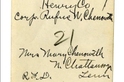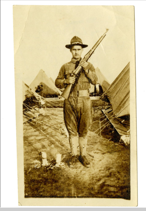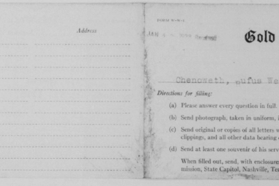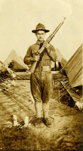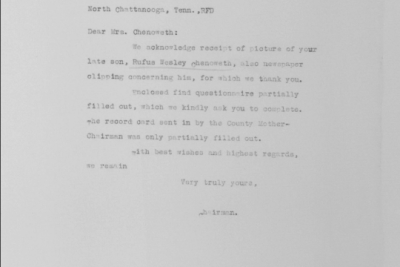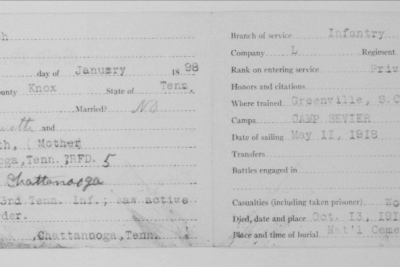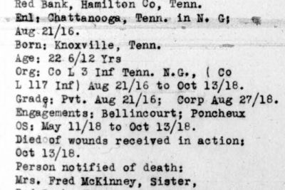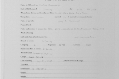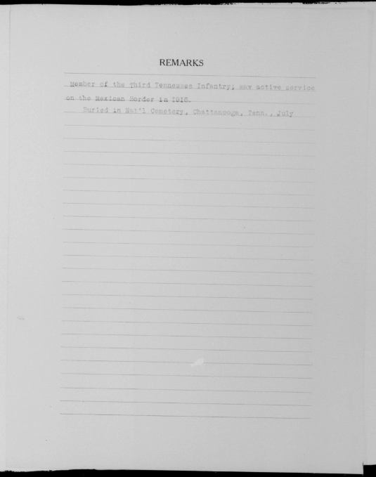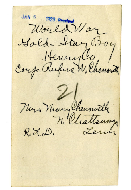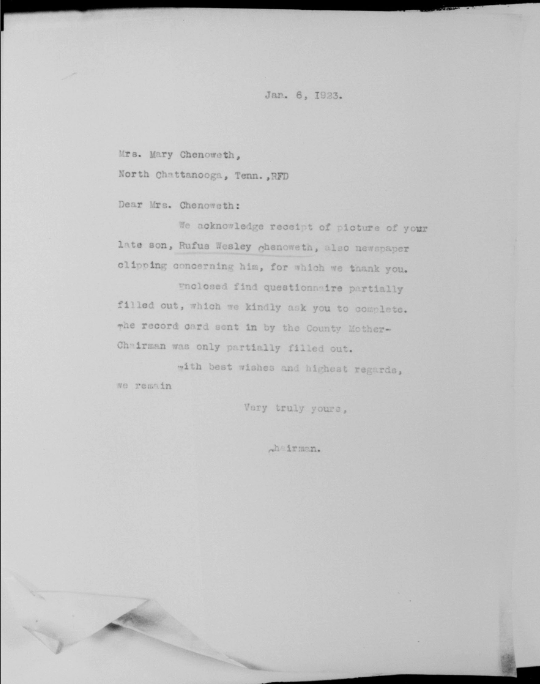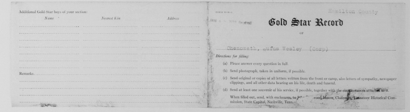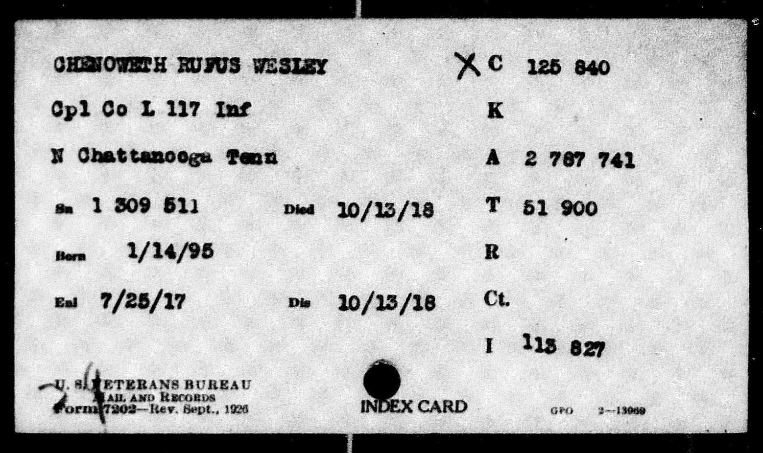 Rufus Wesley Chenoweth as a member of the Third Tennessee Infantry saw active service on the Mexican Border in 1916. Was again called to the colors in 1917. As a member of Company L, 117th Infantry, 30th Division was stationed at Camp Sevier, SC. Sailed for France May 11, 1918, and as a member of the American Expeditionary Force (AEF), participated in all engagements of his command until wounded on October 6 in the Hindenburg Line attack. As a result of same wounds died on October 13, 1918. Had the rank of corporal.