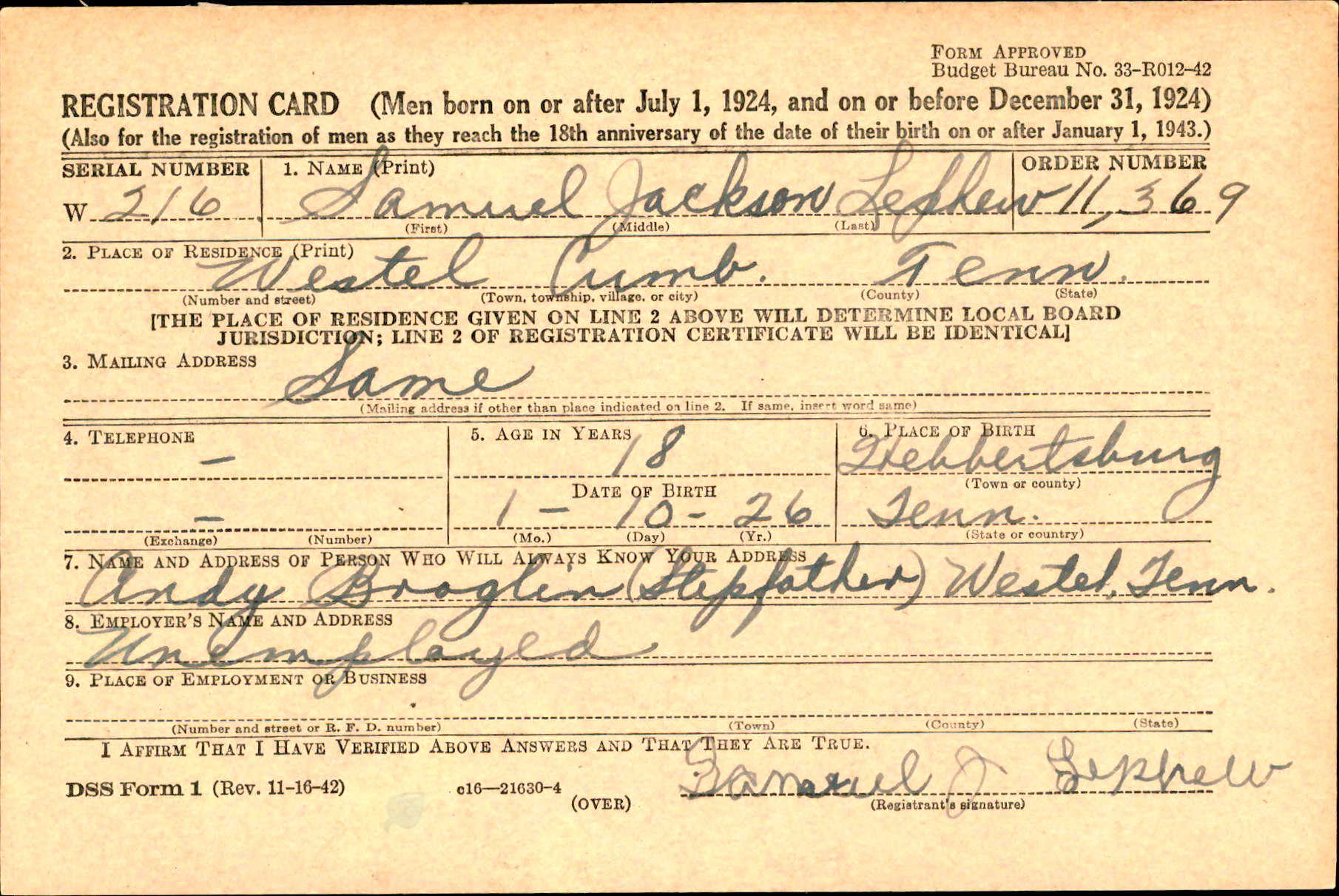Samuel Jackson “Jack” Lephew was born in Tennessee in 1926, son of Cicero Lephew and Lillie Mae Carver.