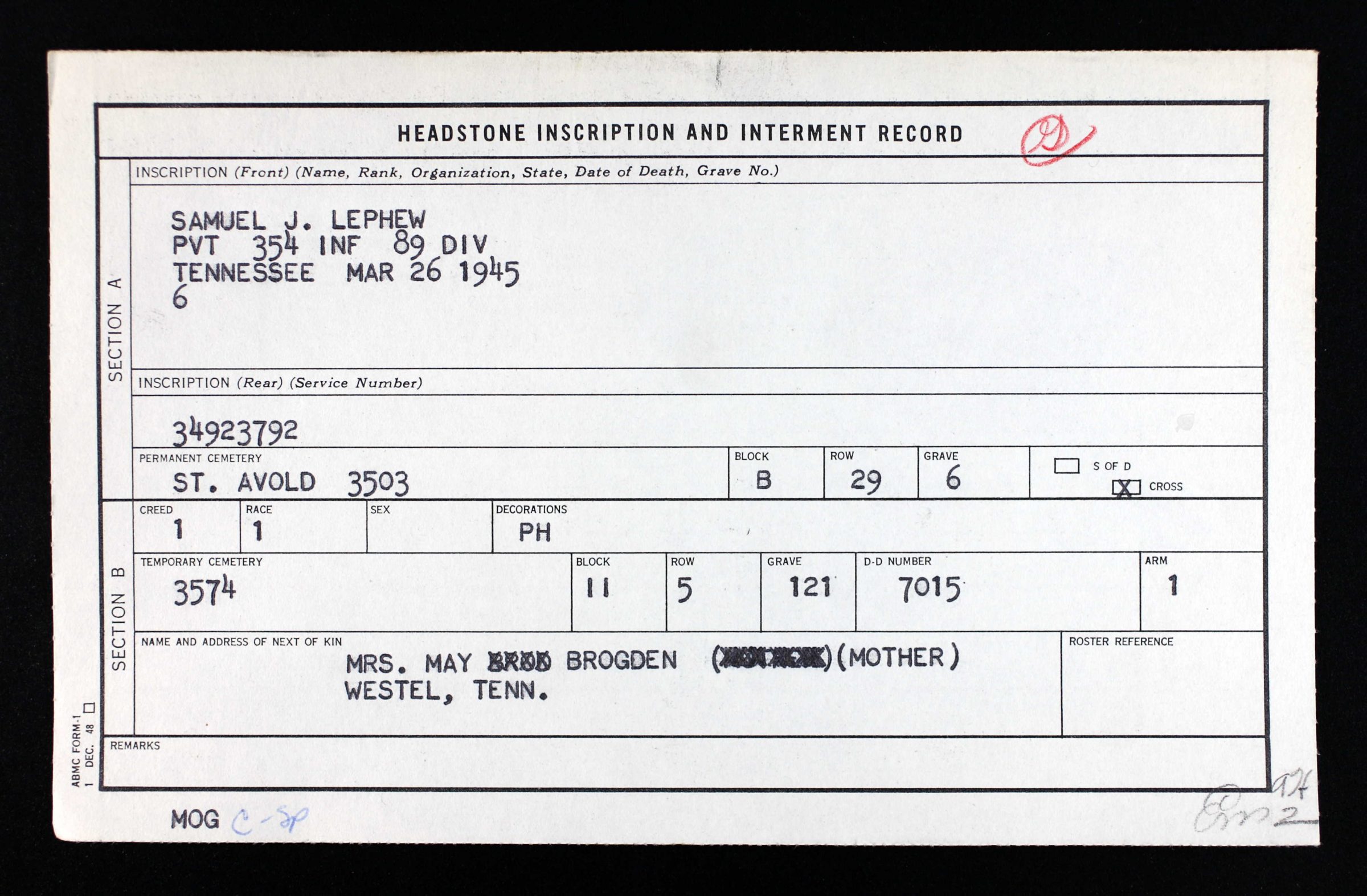 Pvt. Samuel J. Lephew, husband of Mrs. Elizabeth Lephew, 3424 Rossville Boulevard, was reported killed in action in Germany on March 26. An infantryman, Pvt. Lephew attended Rockwood, Tenn., school and entered the army in February, 1943. He had been overseas two months.