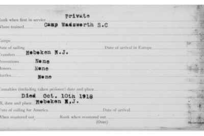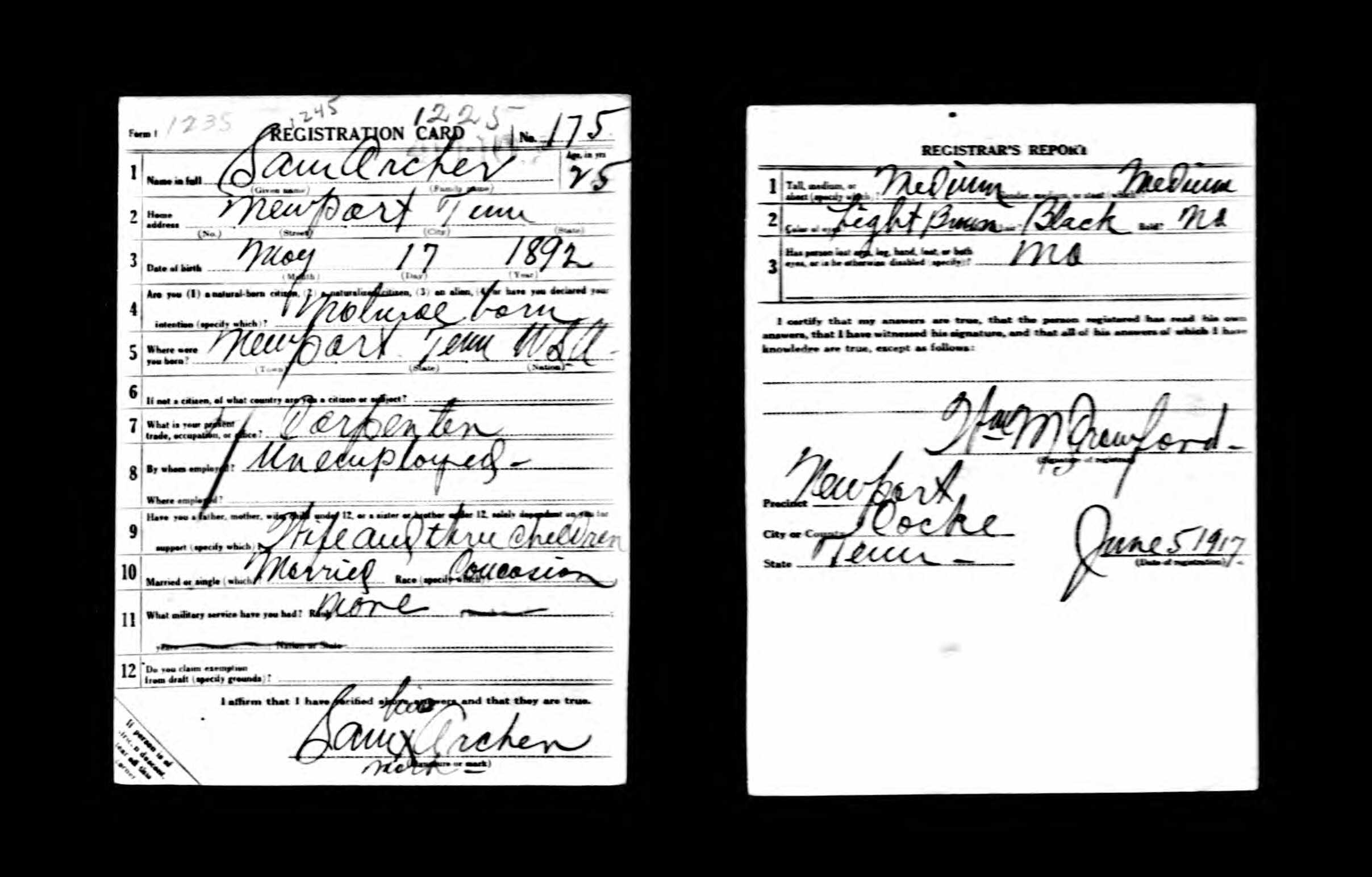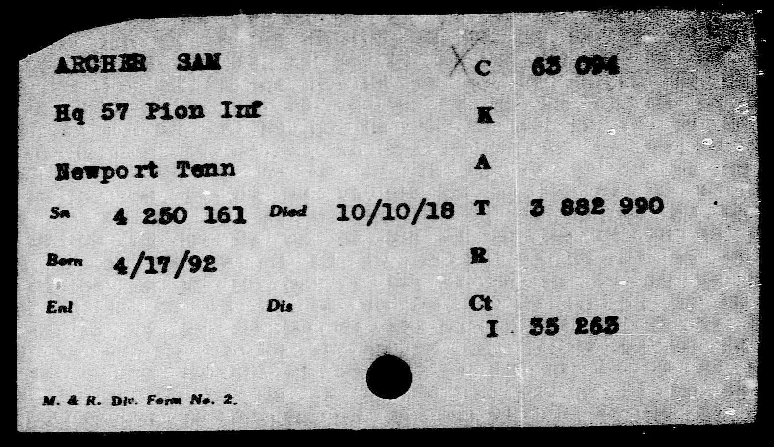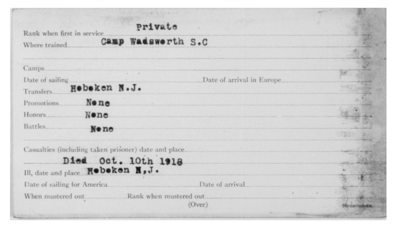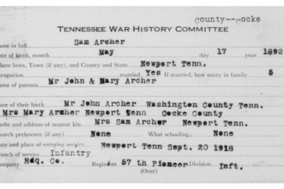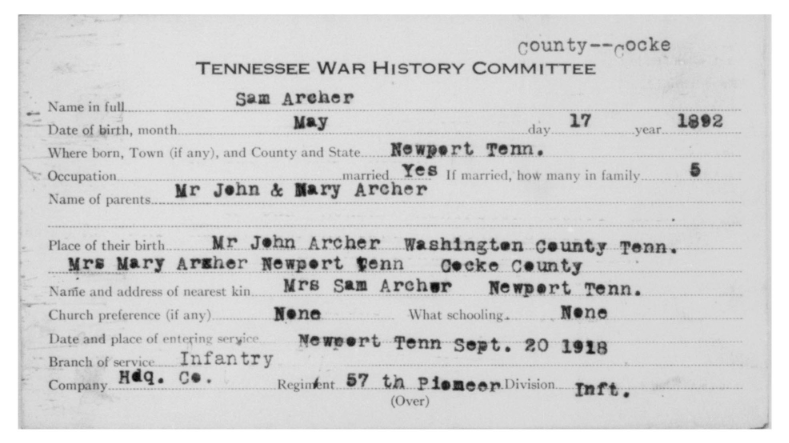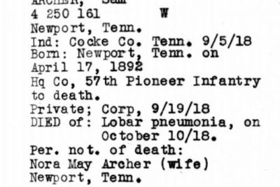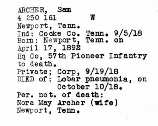 Sam Archer was born 17 May 1892, Newport, Tennessee to John and Mary Archer. Cpl Archer was the husband of Nora Sumner and father of Charles Edward Archer. He died of lobar pneumonia on 10 October 1918 at Hoboken in New Jersey.