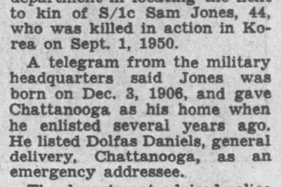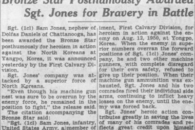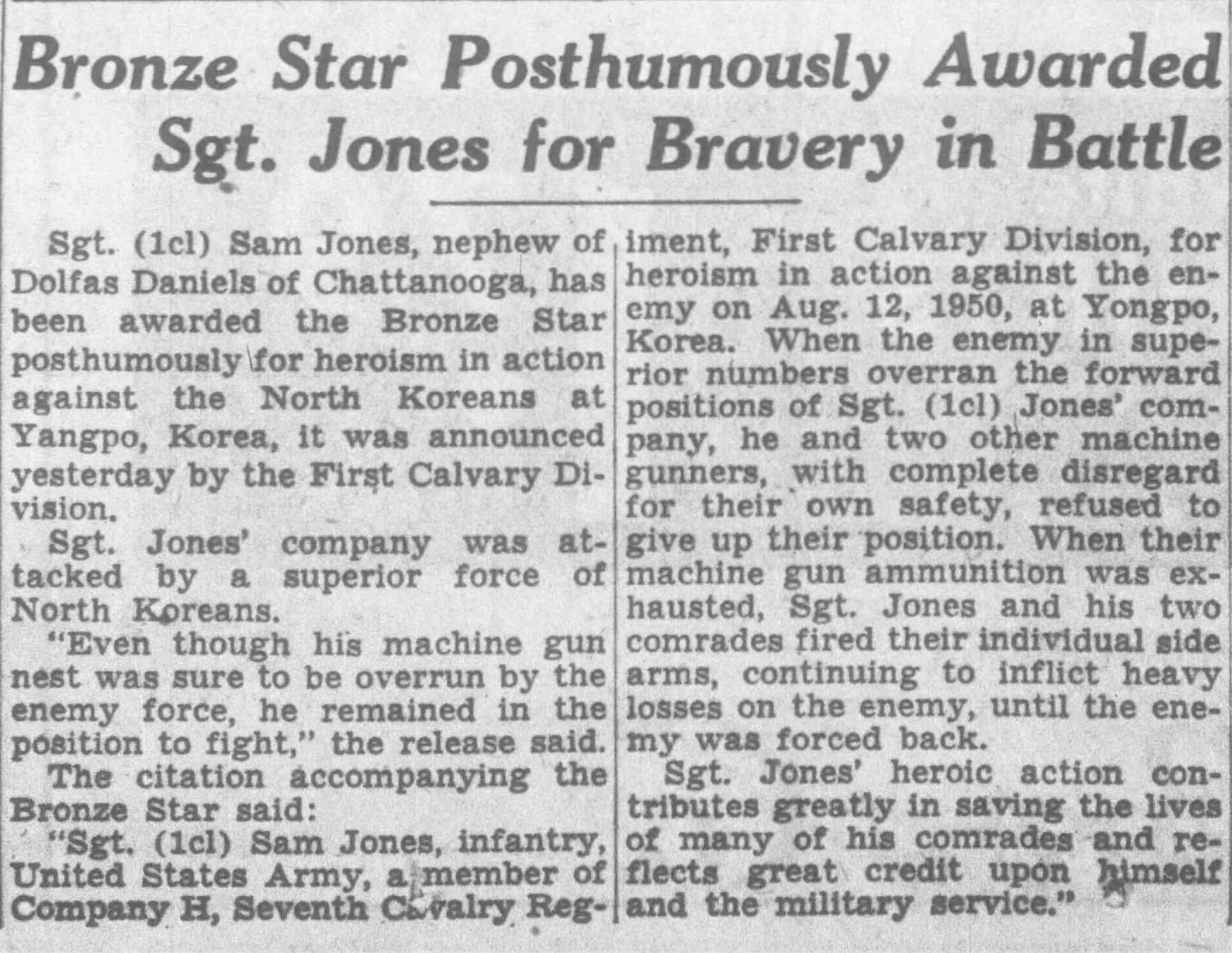 Sgt. (1cl) Sam Jones, nephew of Dolfas Daniels of Chattanooga, has been awarded the Bronze Star posthumously for heroism in action against the North Koreans at Yangpo, Korea, it was announced yesterday by the First Calvary Division. Sgt. Jones’ company was attacked by a superior force of North Koreans. “Even though his machine gun nest was sure to be overrun by the enemy force, he remained in the position to fight,” the relase said. The citation accompanying the Bronze Star said: “Sgt. (1cl) Sam Jones, infantry United States Army, a membeer of Company H. Seventh Cavalry Regiment, First Calvary Division, for heroism in action against the enemy on Aug. 12, 1950 at Yongpo, Korea. When the enemy in superior members overran the forward positions of Sgt. (1cl) Jones’ company, he and two other machine gunners, with complete disregard for their own safety, refused to give up their position. When their machine gun ammunition was exhausted, Sgt. Jones and his two comrades fired their individual side arms, continuing to inflict heavy losses on the enemy, until the enemy was forced back. Sgt. Jones heroic action contributes greatly in saving the lives of many of his comrades and reflects great credit upon himself and the military service.”