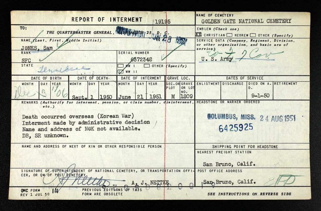 Sergeant First Class Jones was a member of Company H, 2nd Battalion, 7th Cavalry Regiment, 1st Cavalry Division. He was Killed in Action while fighting the enemy in South Korea. Buried at Golden Gate National Cemetery, San Bruno, CA, M, 1809.
