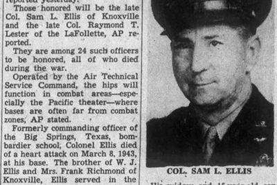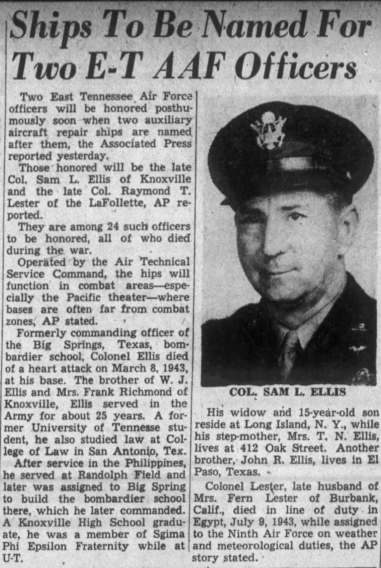 Colonel Sam Love Ellis died at his home, 100 Washington Blvd., Big Spring in Texas of a heart attack. Colonel Ellis was assigned to the bombardier school in Big Spring in June 1942 as project office and became Commander when the school was activated in September.
