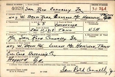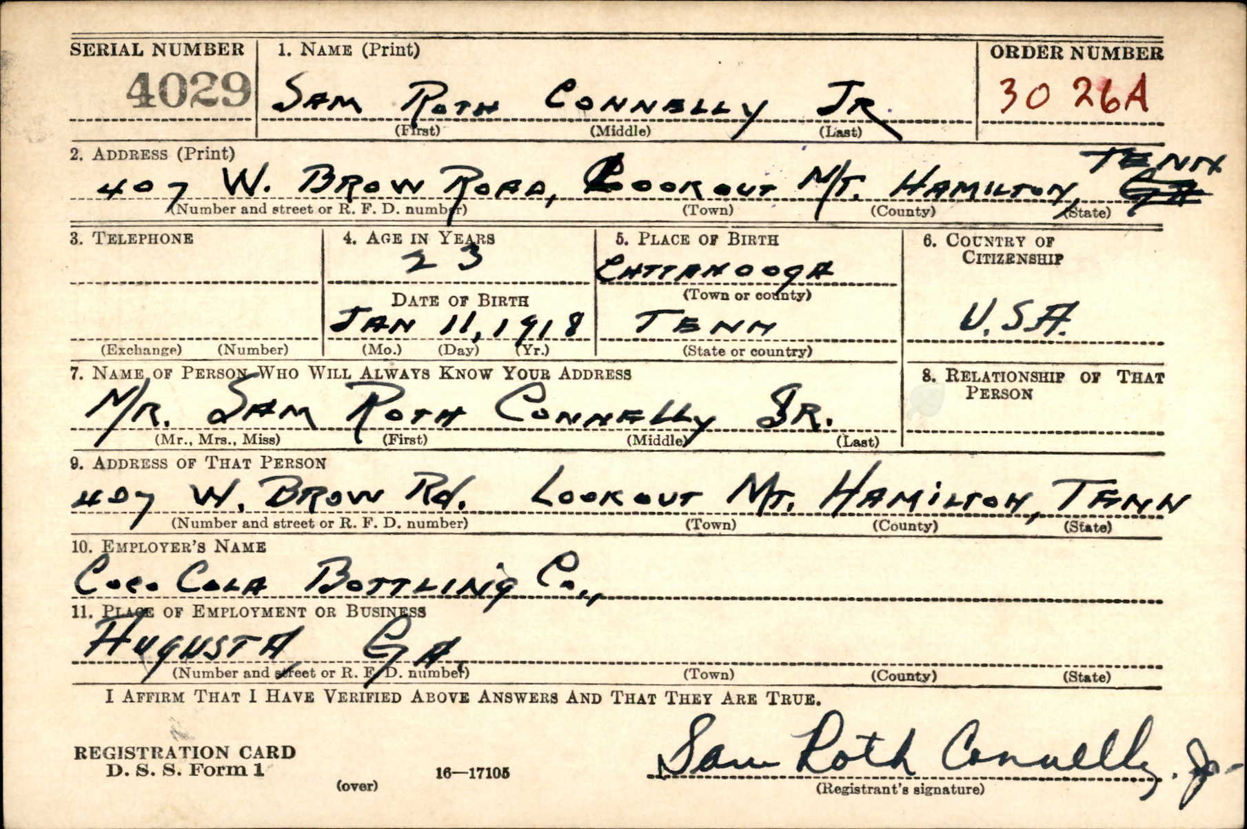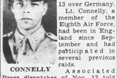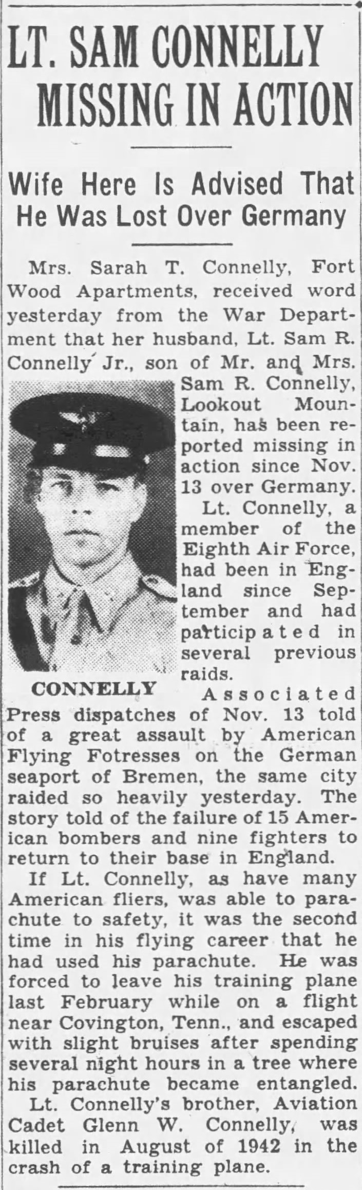 Lt. Sam R. Connelly Jr., who previously was reported missing in action, was killed in action Nov. 13 in a bombing raid in a European theater. The official War Department telegram to Mrs. Connelly read: “Report received from the German Government through the International Red Cross states your husband, Second Lt. Sam R. Connelly Jr., who was previously reported missing in action, was killed in action Nov. 13 in the European area. The Secretary of War extends his deep sympathy. Letter follows.” Lt. Connelly’s brother, A/C Glenn W. Connelly, youngest son of the family, was killed in an airplane accident at Turner Field, Albany, Ga., last April. He also was a Baylor graduate and attended the university of Virginia. The airmen were only sons of Mr. and Mrs. Sam R. Connelly of Lookout Mountain, who are reported on a Florida visit at present.