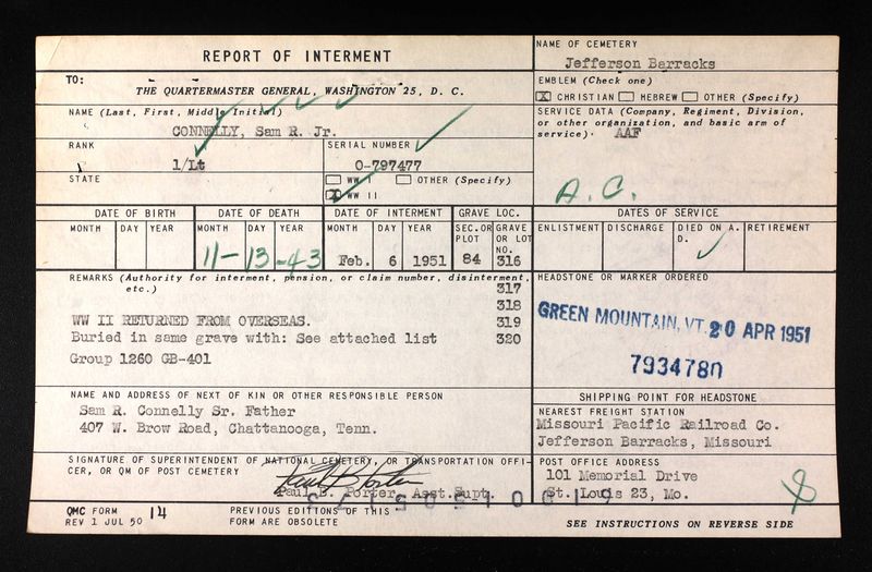 2nd Lt Connelly is buried at Jefferson Barracks National Cemetery, Saint Louis, Missouri in the same grave with