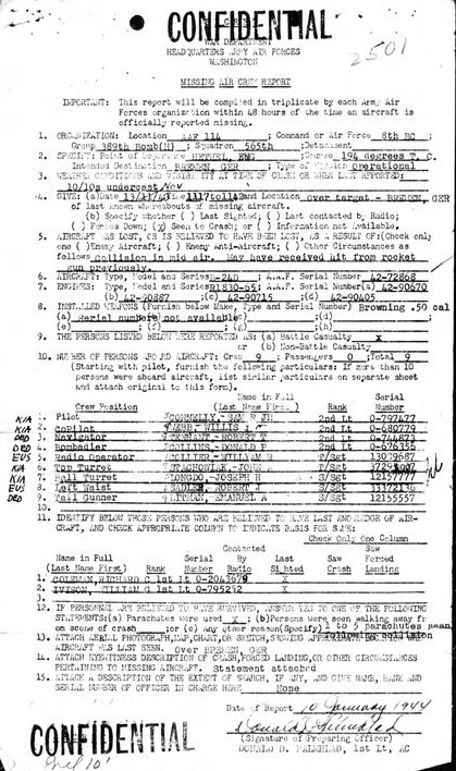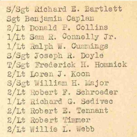 S/Sgt Richard E. Bartlett, Sgt Benjamin Caplan, 2nd Lt Donald P. Collins, 1st Lt Ralph W. Cummings, S/Sgt Joseph R. Doyle, T/Sgt Frederick H. Homnick, S/Sgt, William H. Major, 2nd Lt Robert F. Schroeder