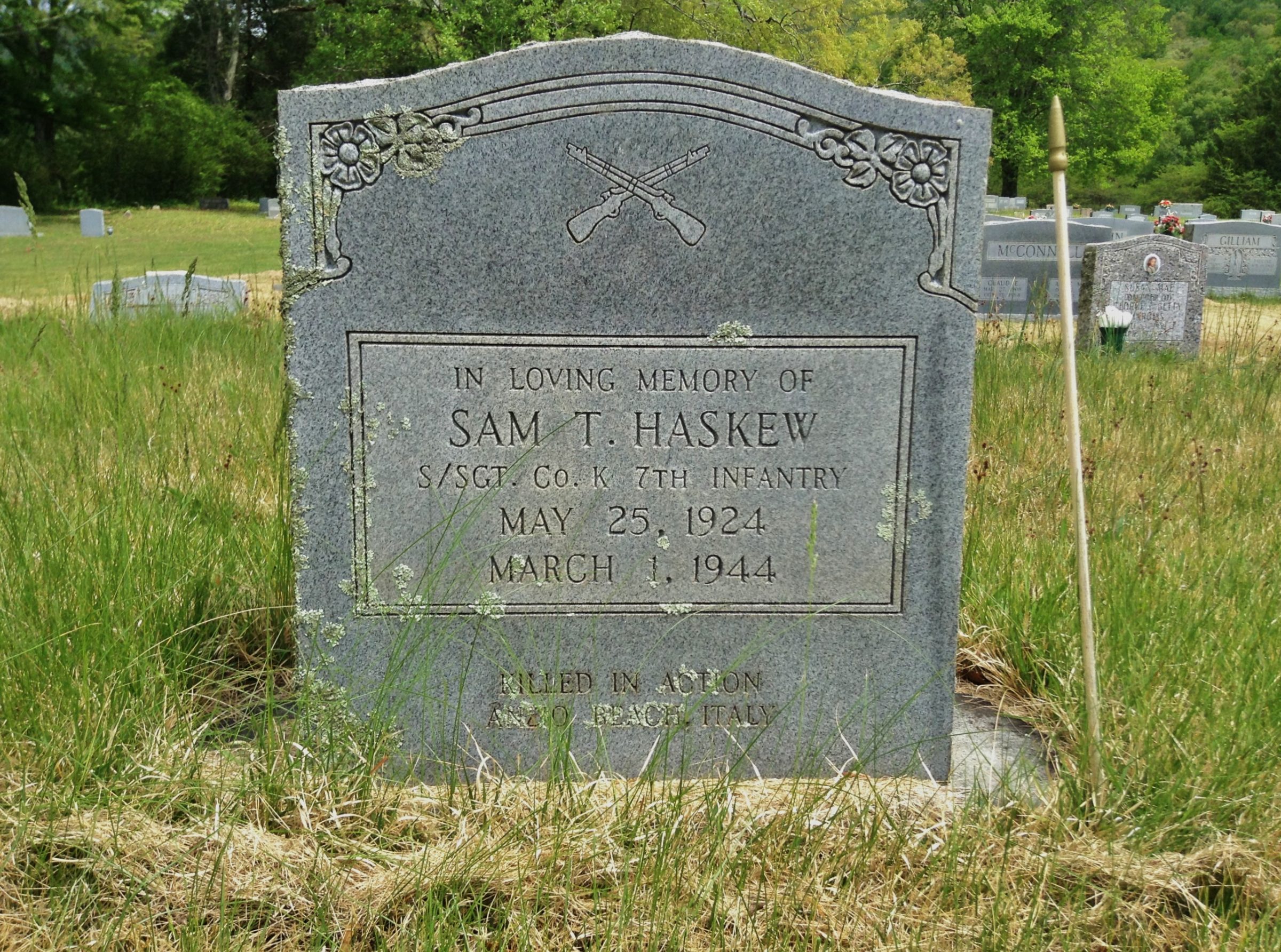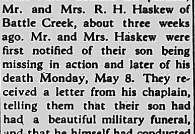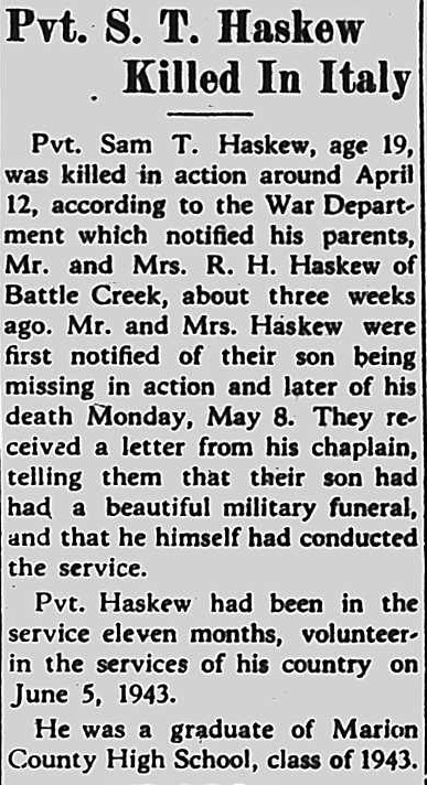 Pvt. Sam T. Haskew, age 19, was killed in action around April 12, according to the War Department which notified his parents, Mr. and Mrs. R.H. Haskew of Battle Creek, about three weeks ago. Mr. and Mrs. Haskew were first notified of their son being missing in action and later of his death Monday, May 8. They received a letter from his chaplain, telling them that their son had had a beautiful military funeral, and that he himself had conducted the service. Pvt. Haskew had been in the service eleven months, vonlunteering the service of his country on June 5, 1943.