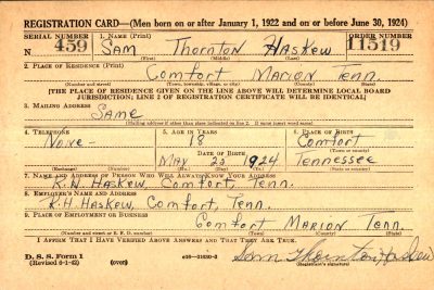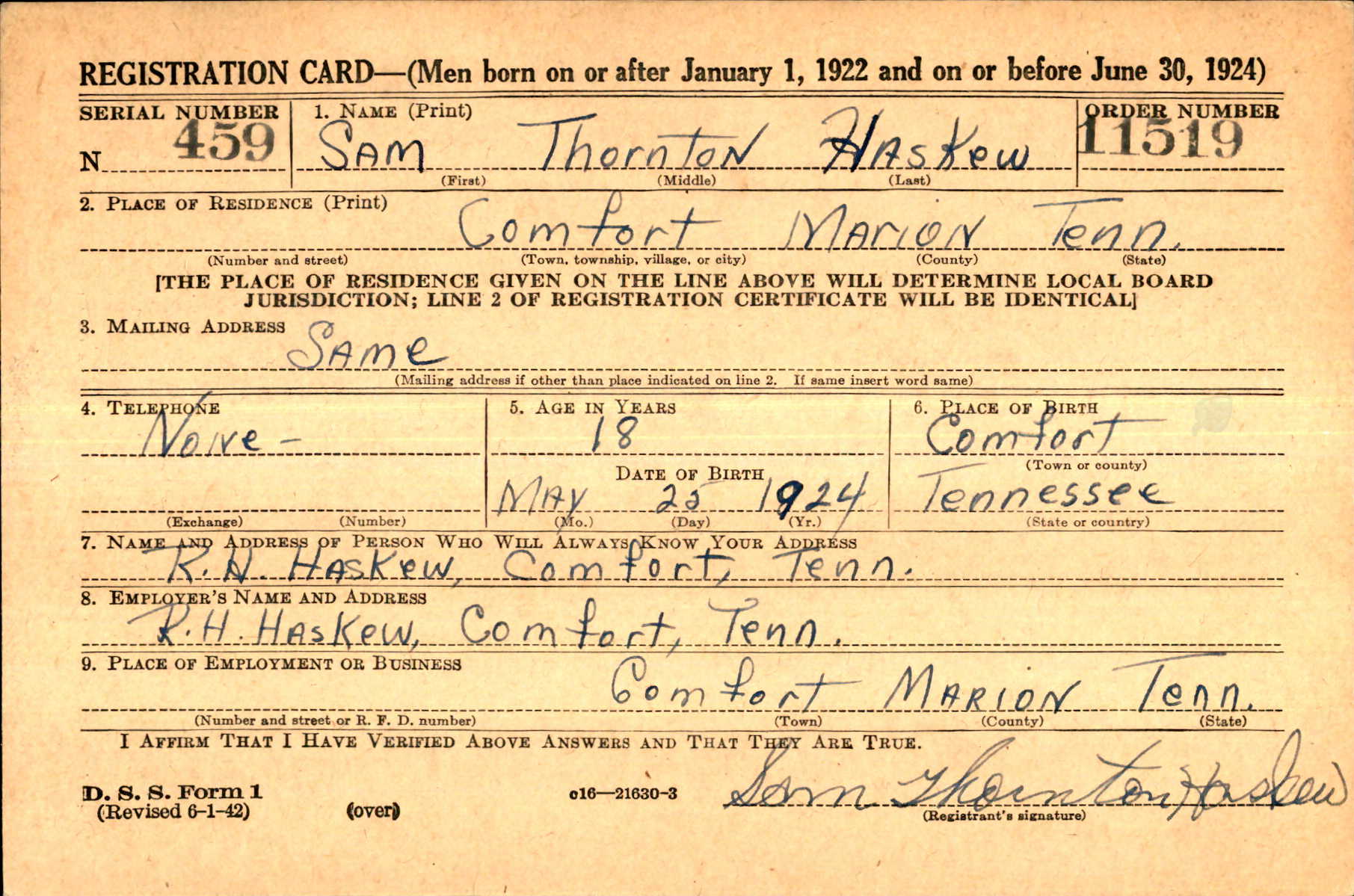 Sam Thornton Haskew was the son of Ransom Herbert Haskew and Gertie Ethel Jackson.