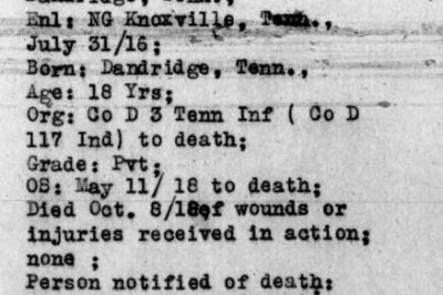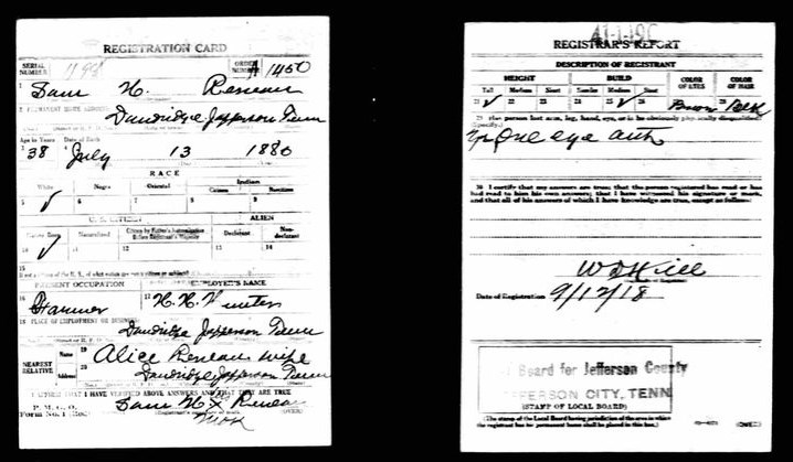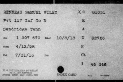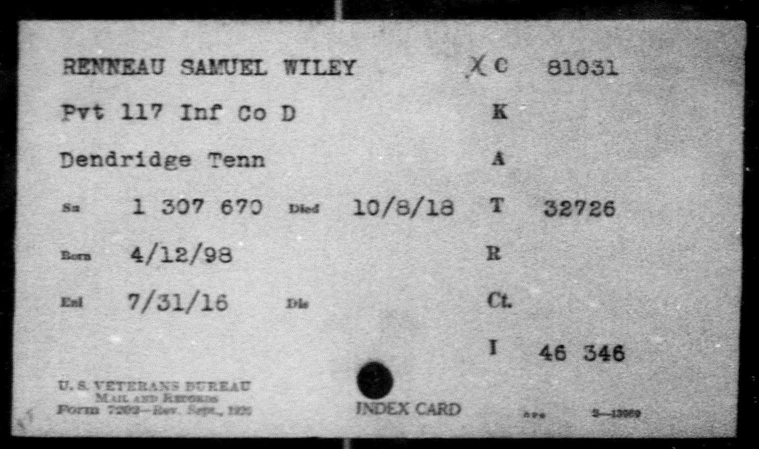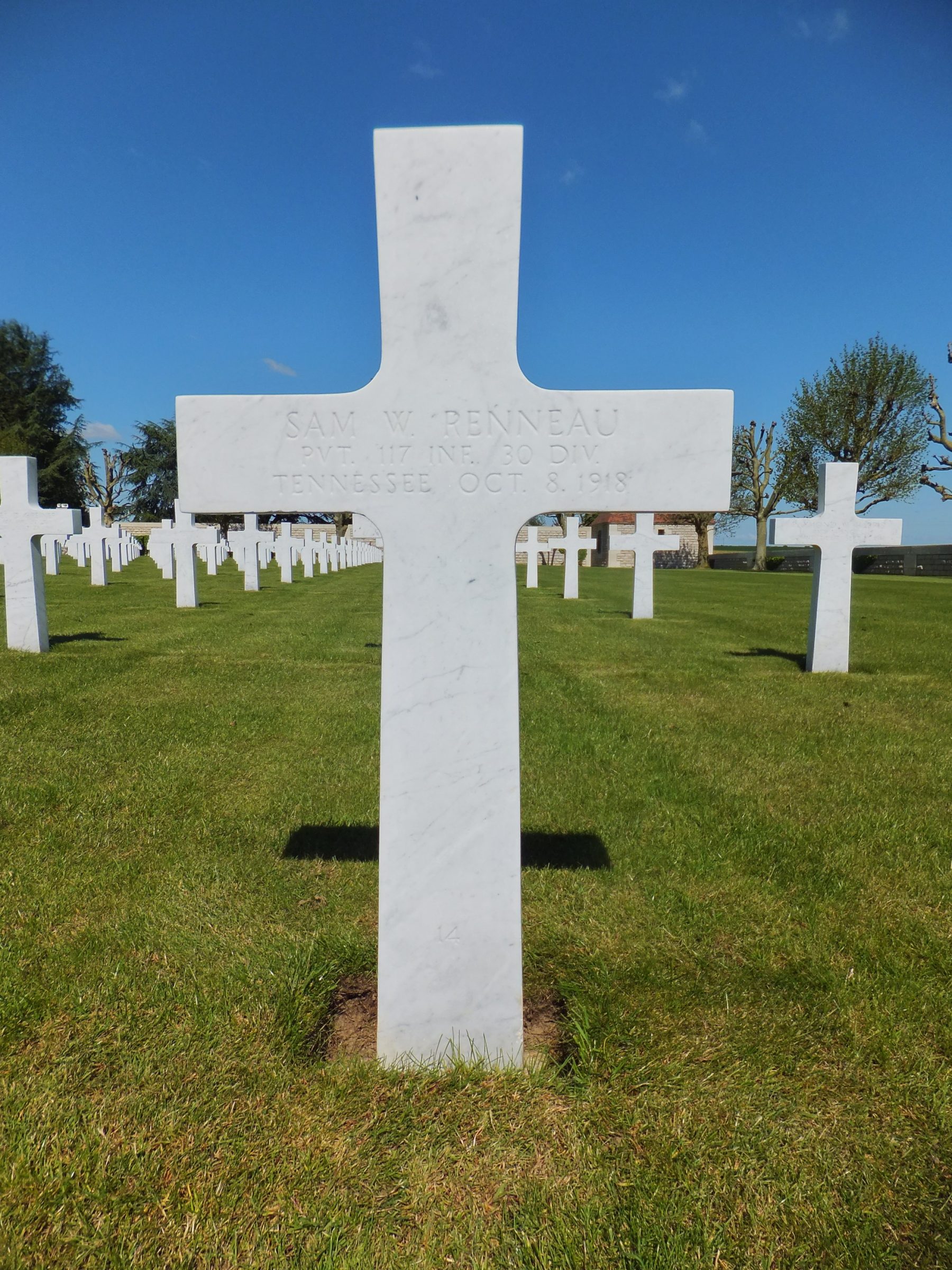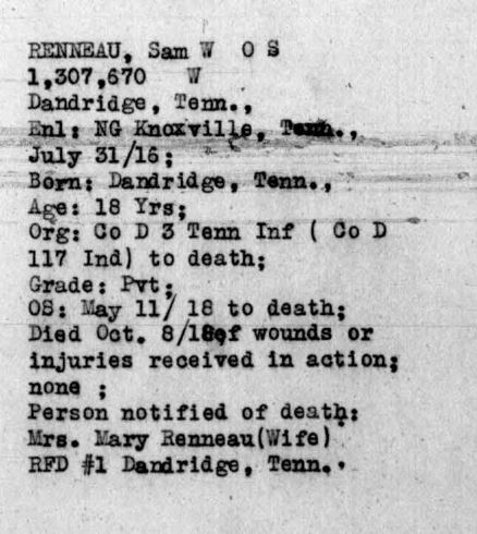 Sam Wiley Renneau was born in Dandridge, Tennessee. He died of wounds received in action and is buried plot D, row 4, grave 14, at the Somme American Cemetery, Bony, France. According to the headstone, his name is spelled with a double N.
