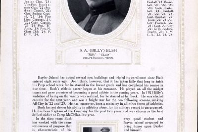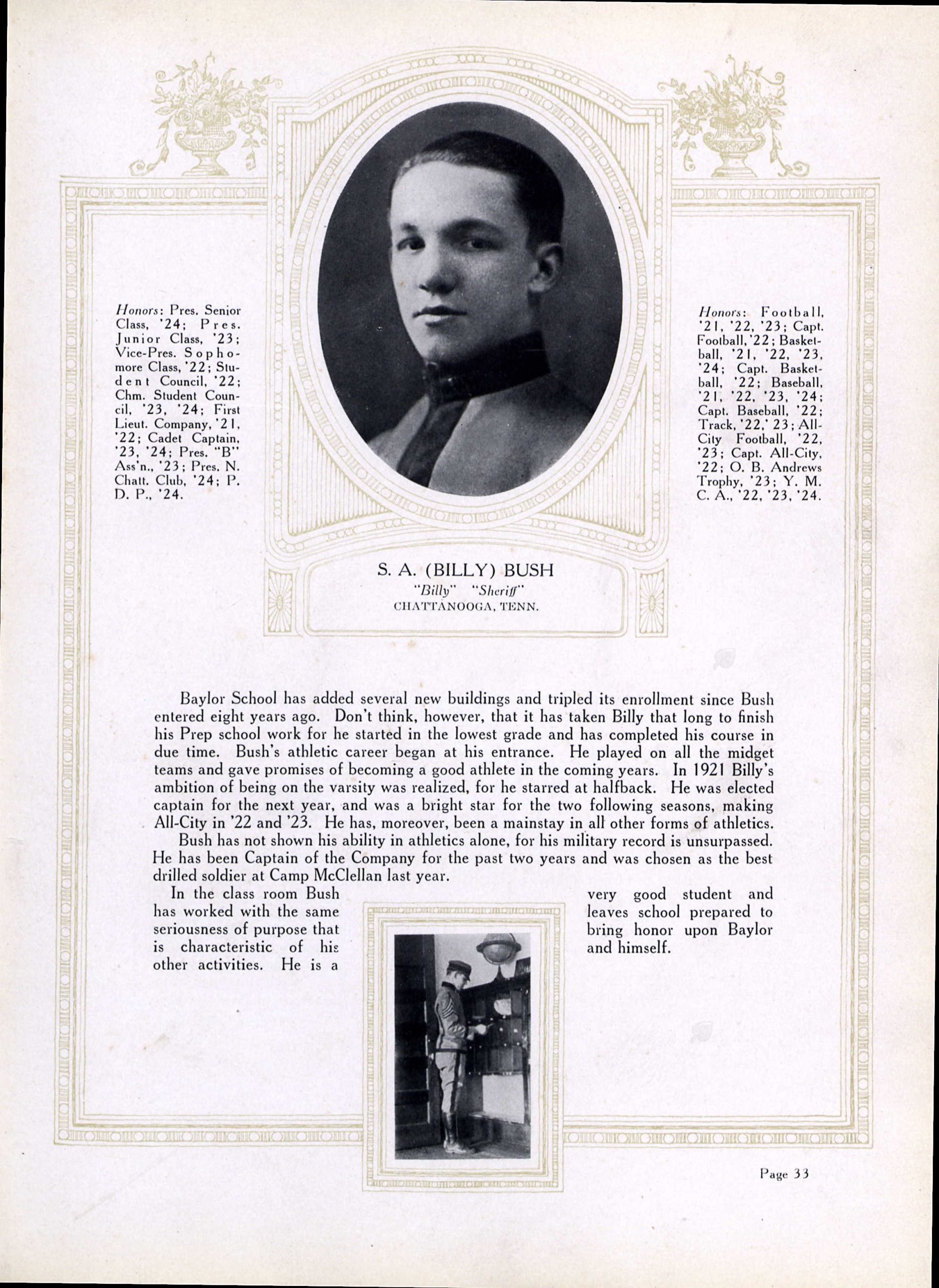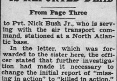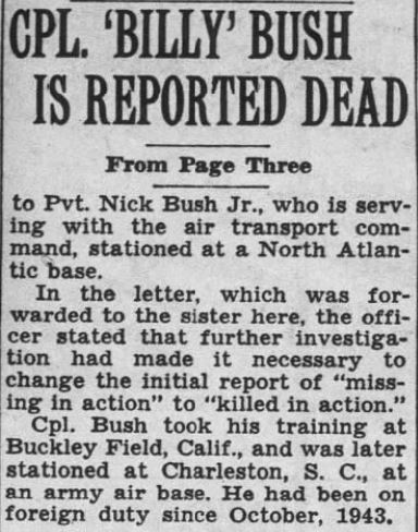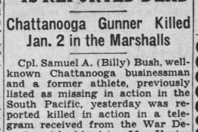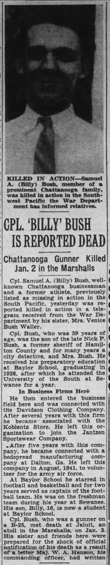 Cpl. Samuel A. (Billy) Bush, well-known Chattanooga businessman and a former athlete, previously listed as missing in action in the South Pacific, yesterday was reported killed in action in a telegram received from the War Department by his sister, Mrs. Venice Bush Waller. Cpl. Bush,who was 39 years of age, was the son of the late Nick P. Bush, a former sheriff of Hamilton County and for many years a city detective, and Mrs. Bush. He received his preparatory education at Baylor School, graduating in 1926, after which he attended the University of the South at Sewanee for a year. He then entered the business field here and was connected with the Davidson Clothing Company. After several years with this firm he became associated with the Koblentz Store. He left this organization to join the Jantzen Sportswear Company. After five years with this company, he became connected with a bedspread manufacturing company at Dalton, Ga. He left this company in August, 1941, to volunteer for the army air force. At Baylor School he starred in football and basketball and for two years served as captain of the football team. He was on the freshman team during his year at Sewanee. His son, Billy, 16, is now a student at Baylor School. Cpl. Bush, who was a gunner on a B-25, met death at Jaluit, an atoll in the Marshalls, on Jan. 2. His sister and friends here were prepared for the shock of official notification of his death as a result of a letter Maj. W.A. Hanson, his commanding officer, had written to Pvt. Nick Bush Jr., who is serving with the air transport command, stationed at a North Atlantic base. In the letter, which was forwarded to the sister here, the officer stated that further investigation had made it necessary to change the initial report of “missing in action” to “killed in action.”Cpl. Bush took his training at Buckley Field, Calif., and was later stationed at Charleston, S.C., at an army air base. He had been on foreign duty since October, 1943.